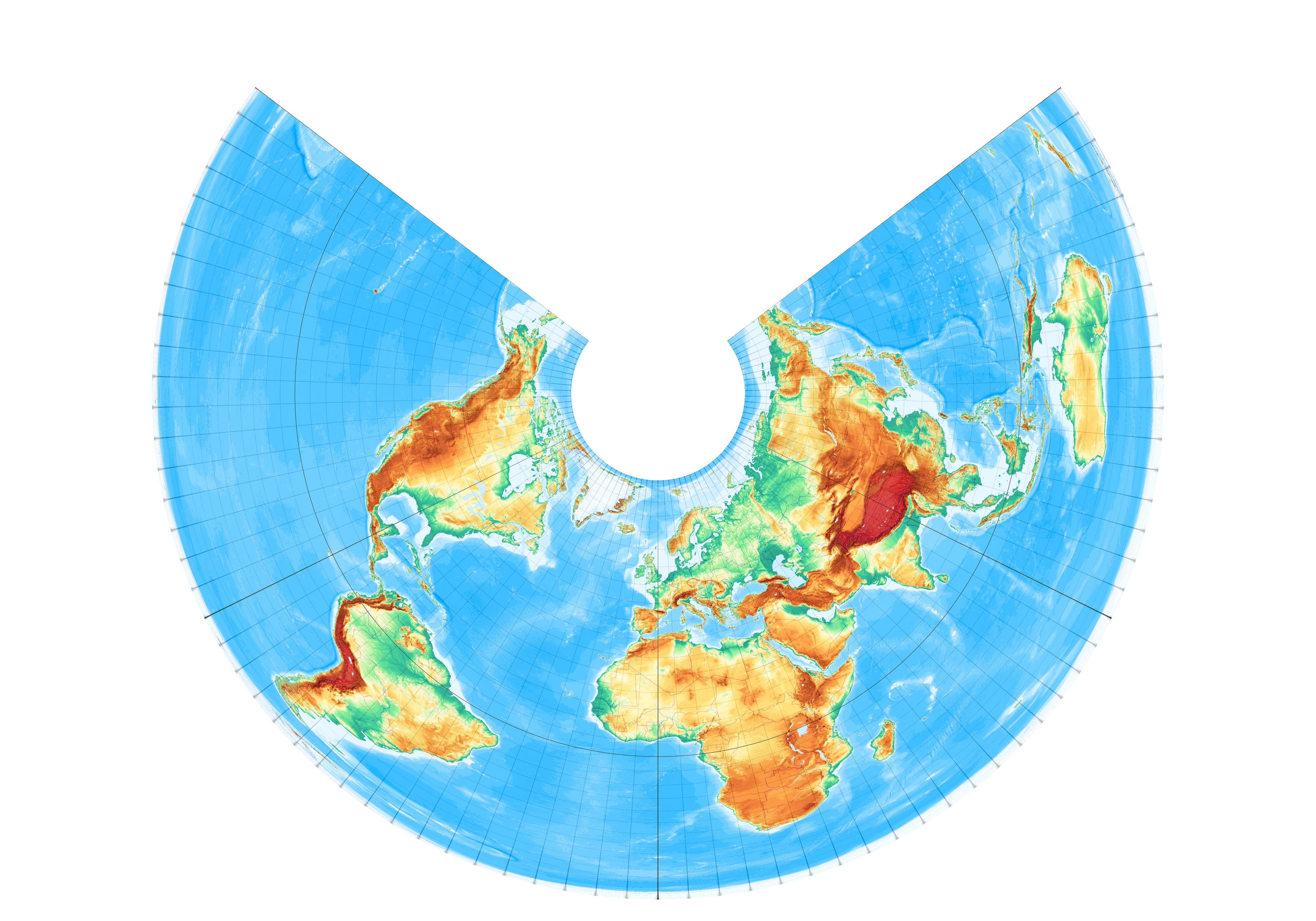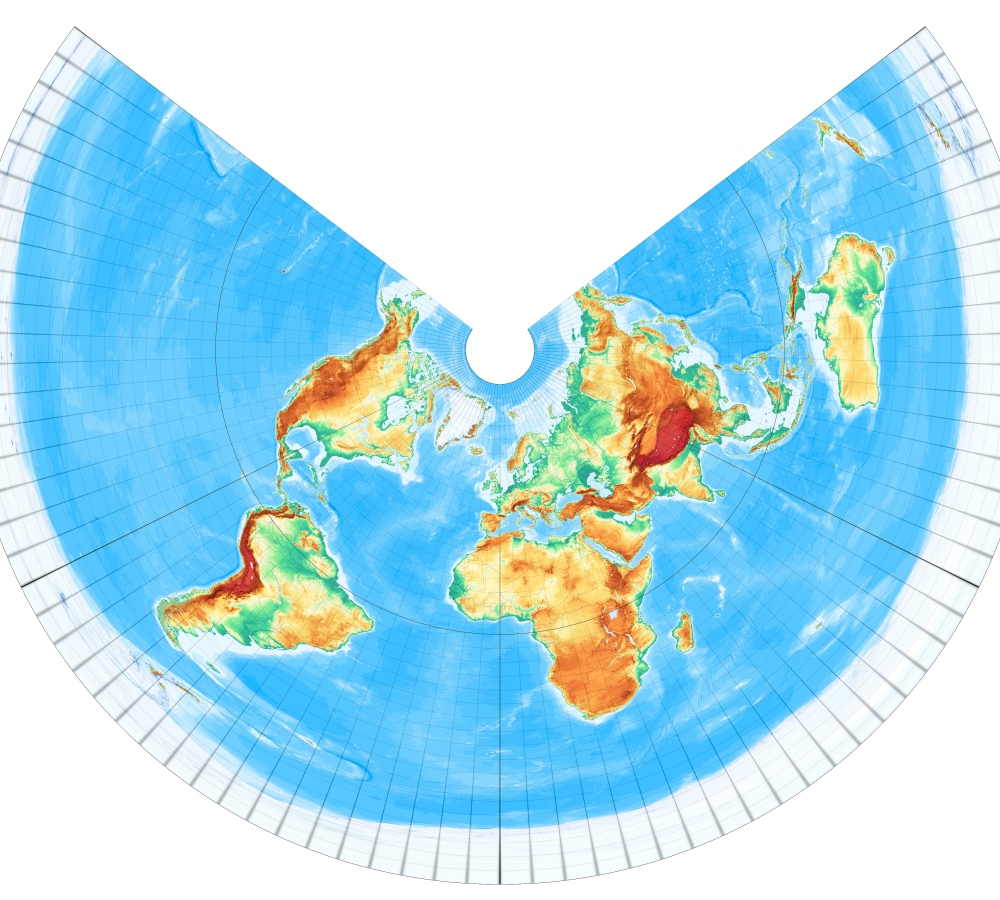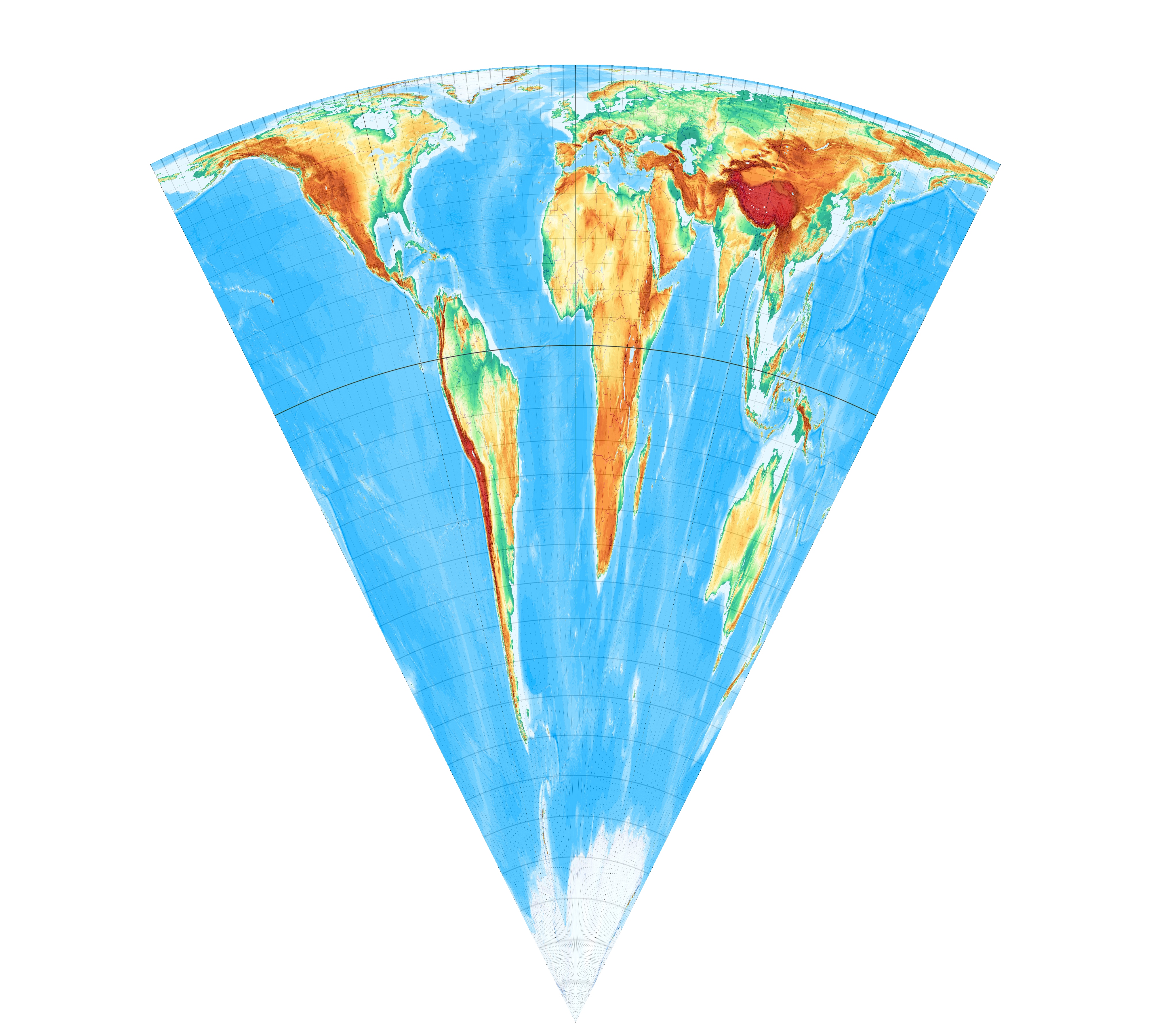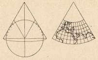 Hier ein schiefer Kegel, dessen Achse in 75°N, 90°W die Erde durchsticht. Das eigenartige Nordmeer ist folglich die Hudson-Bay, in der dieser Punkt liegt. Schnittkegel mit Schnittparallelen 29° und 31°.