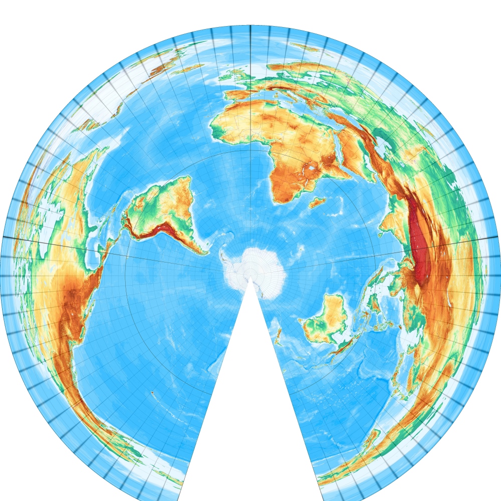 Flächentreuer Kegelentwurf mit Südpol als Punkt, -45° längentreu. Equal-area cone with standard parallel -45°: