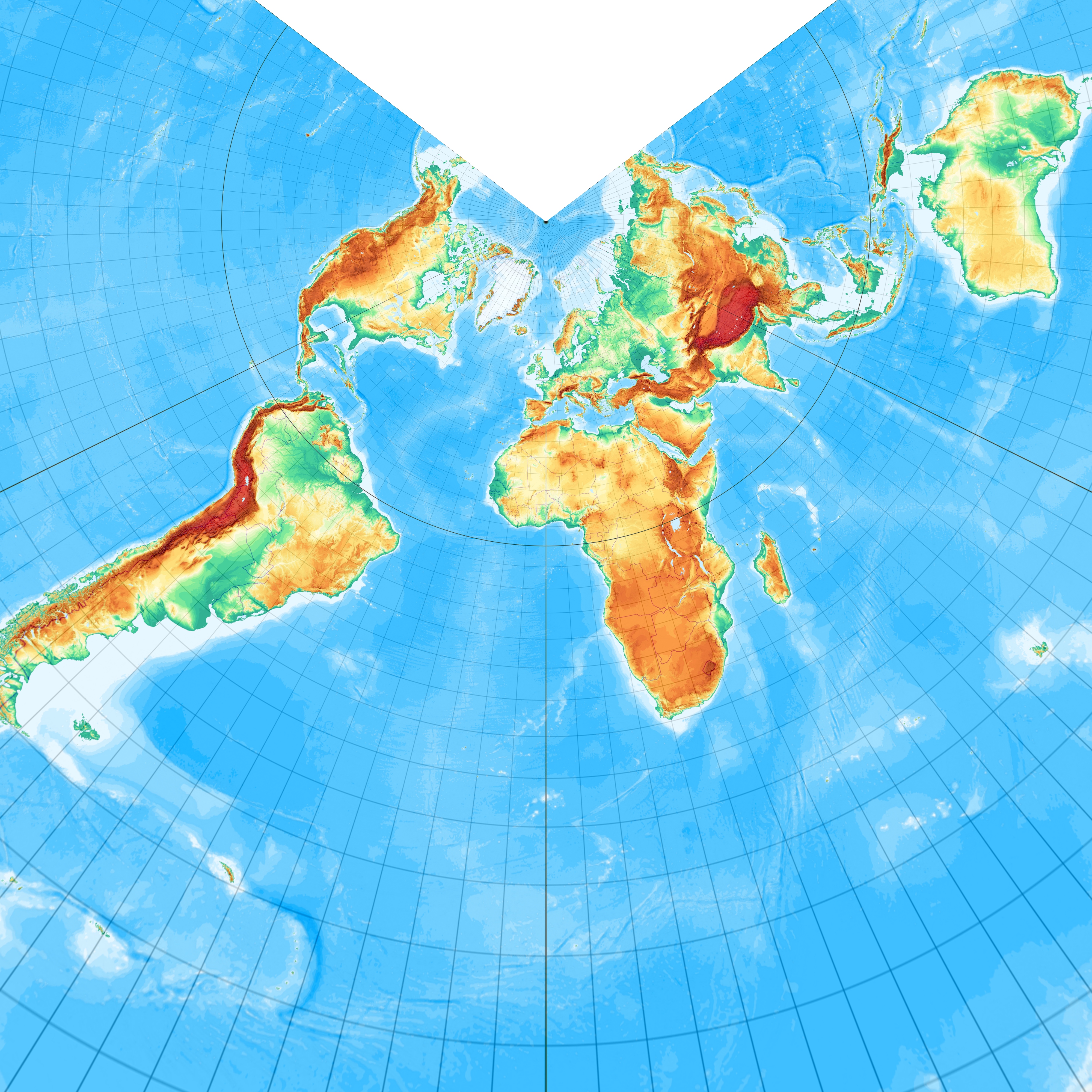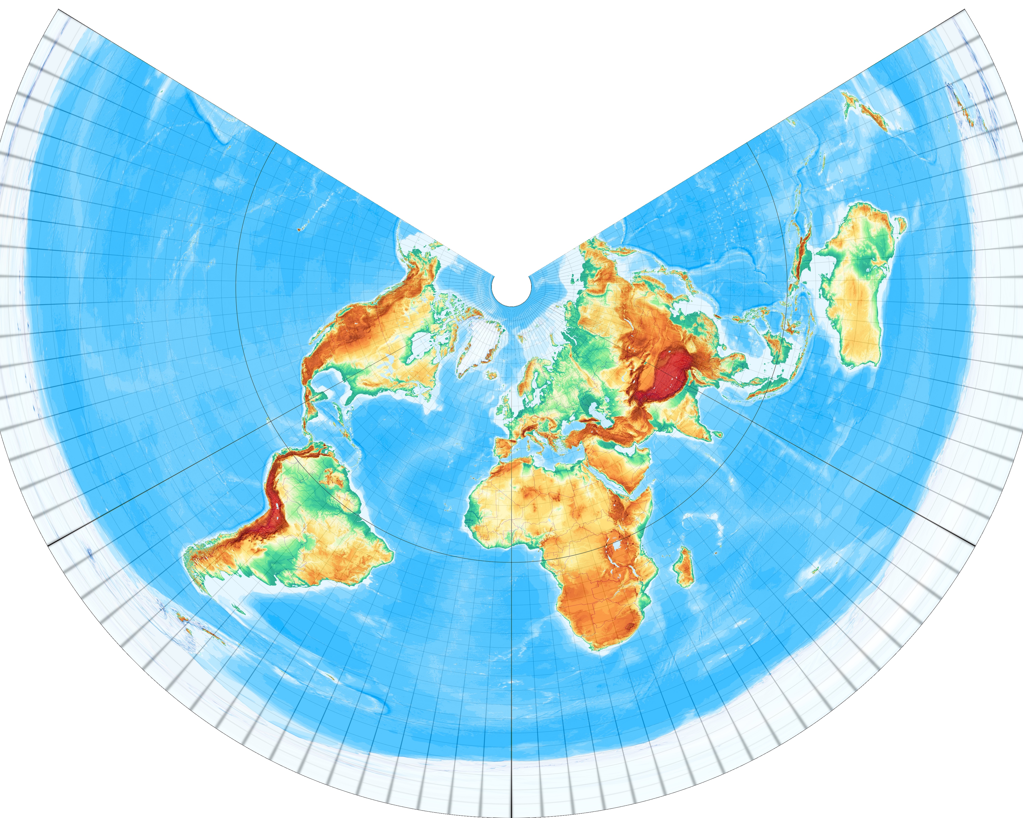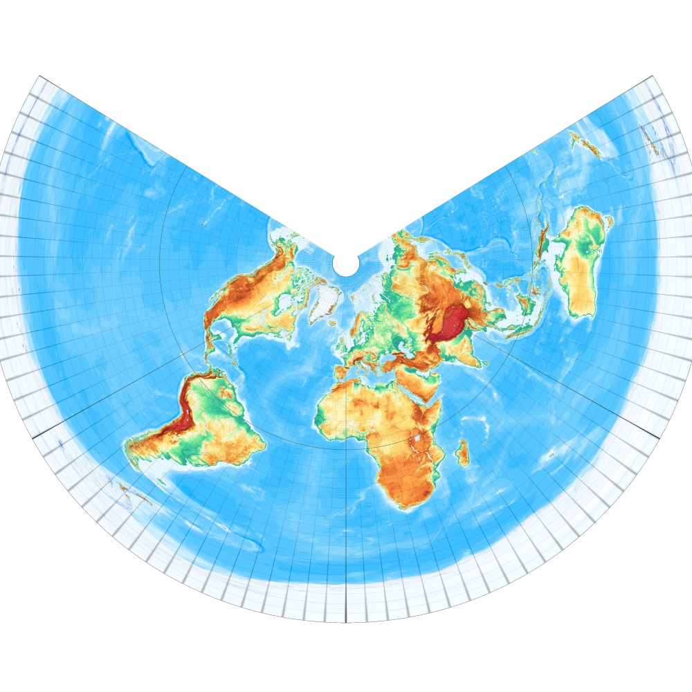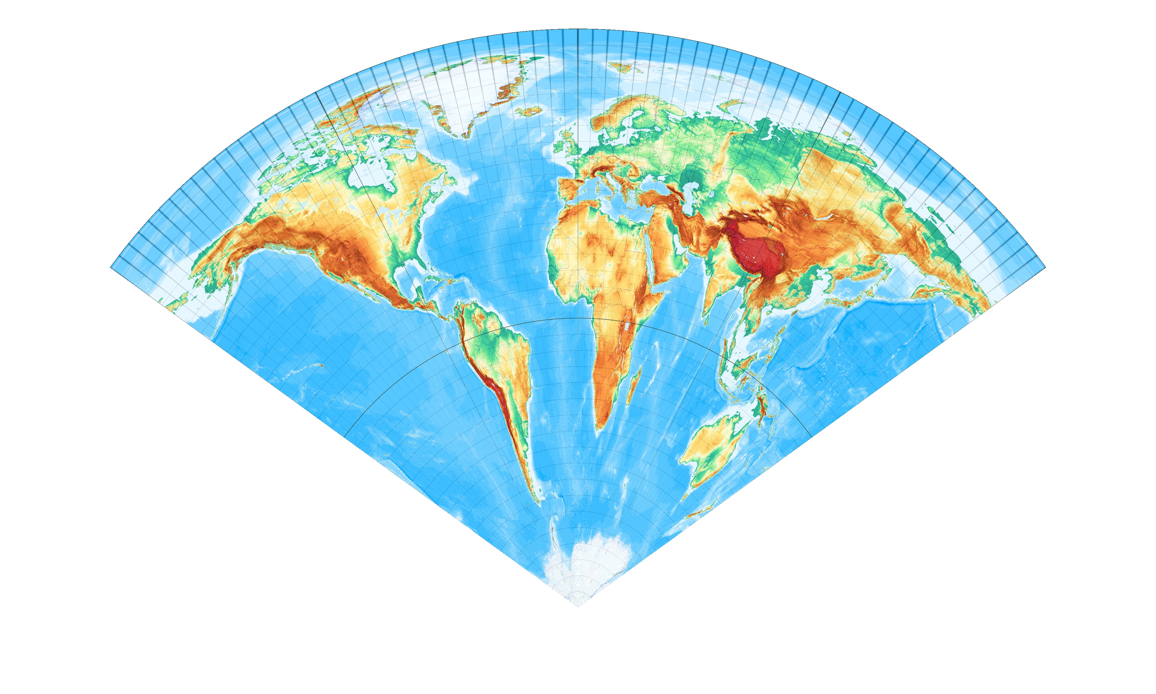 Häufig ist auch der Alberssche flächentreue Kegelentwurf aus dem Jahr 1805 anzutreffen, der zwei Parallelkreise (hier 15° und 75°) längentreu abbildet [Entwurf 4]. Equal-area Conic with two standard parallels or Albers Equal-area Conic (1805):