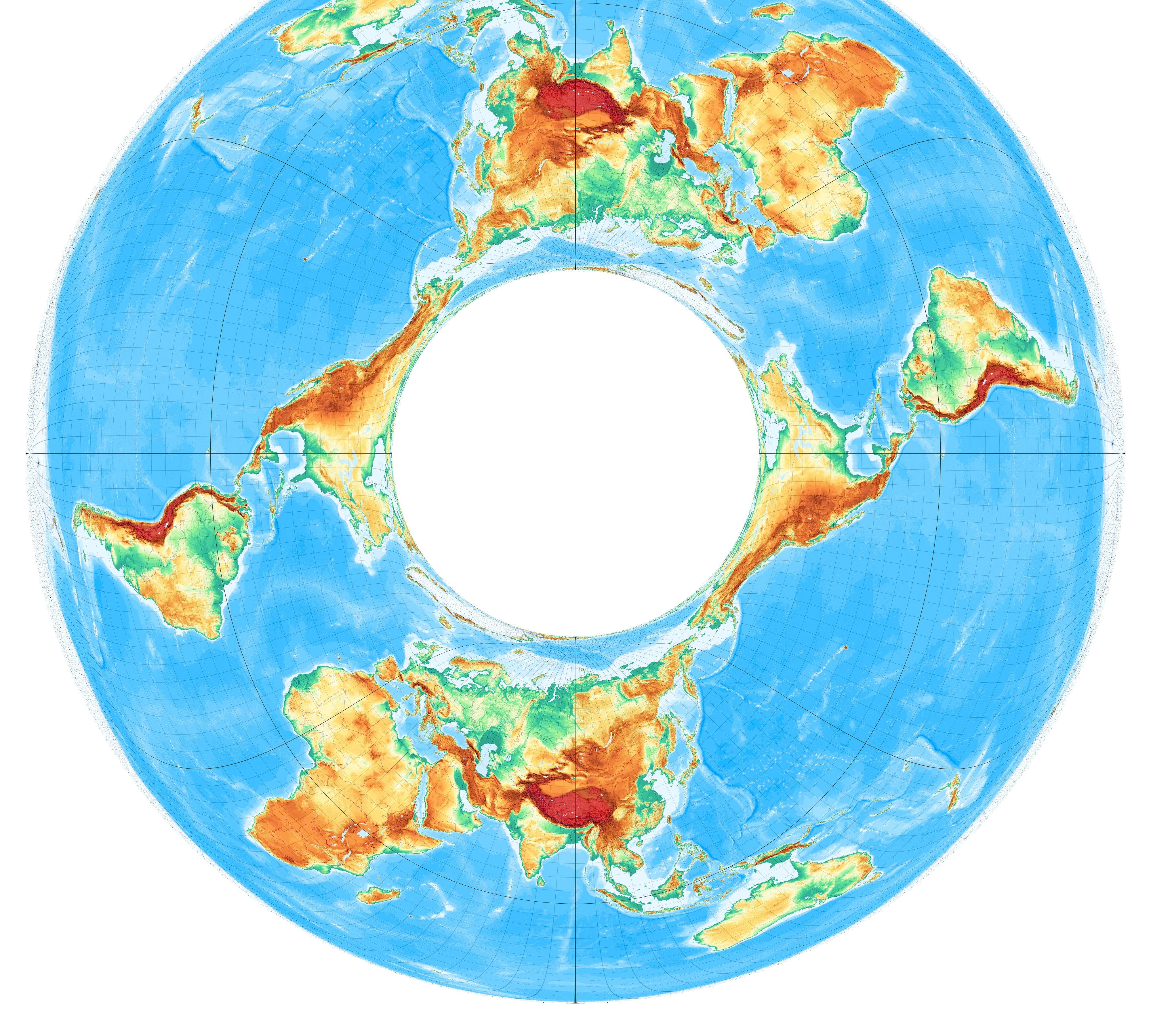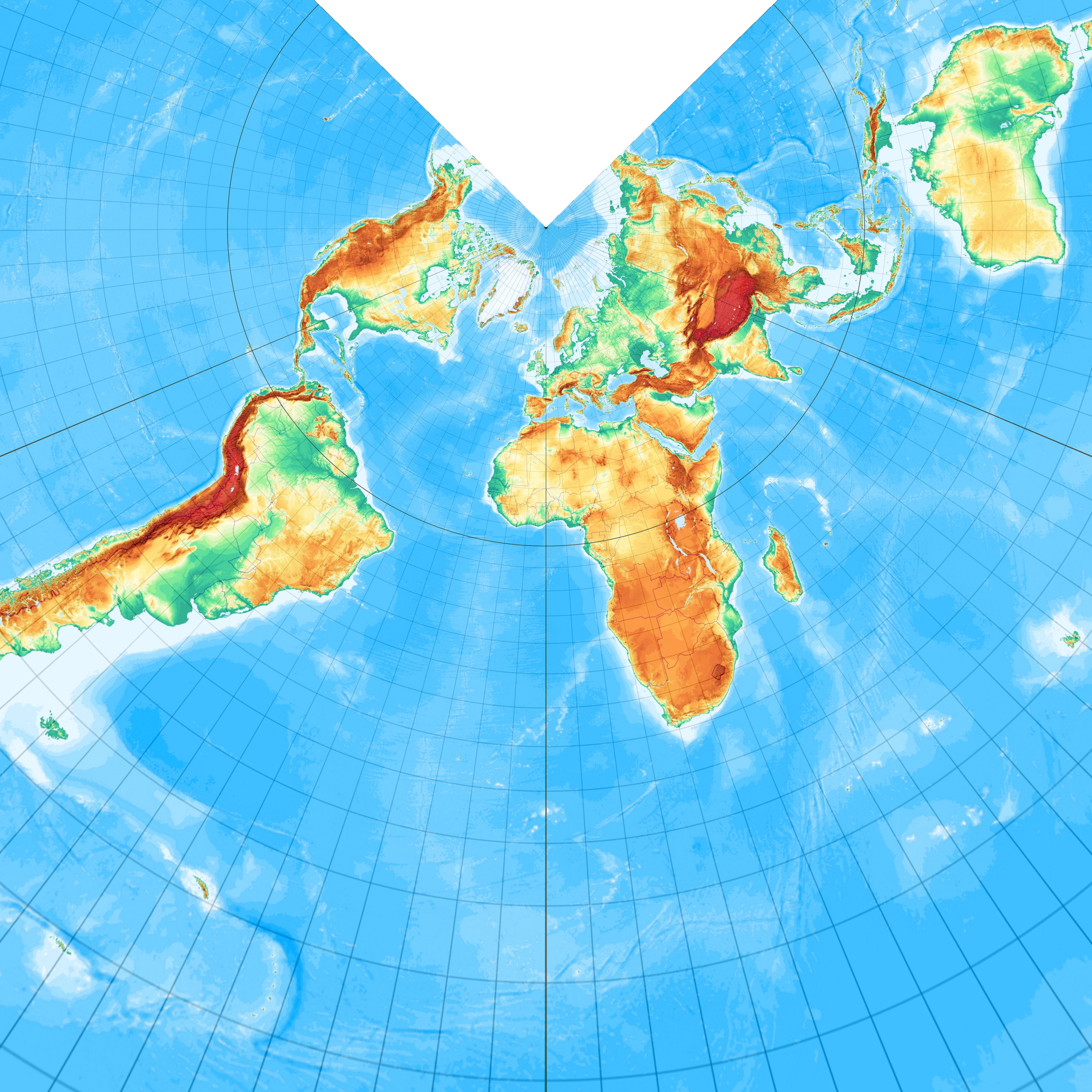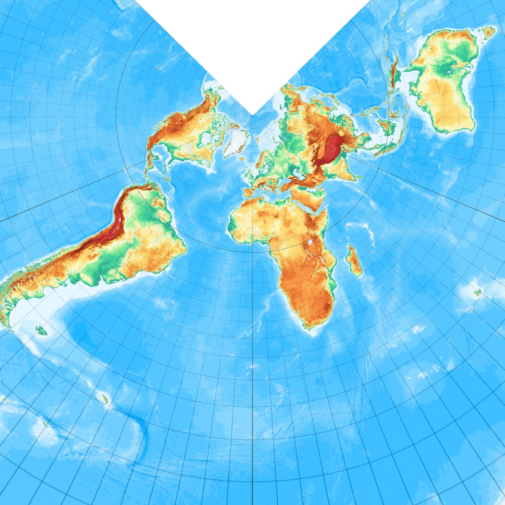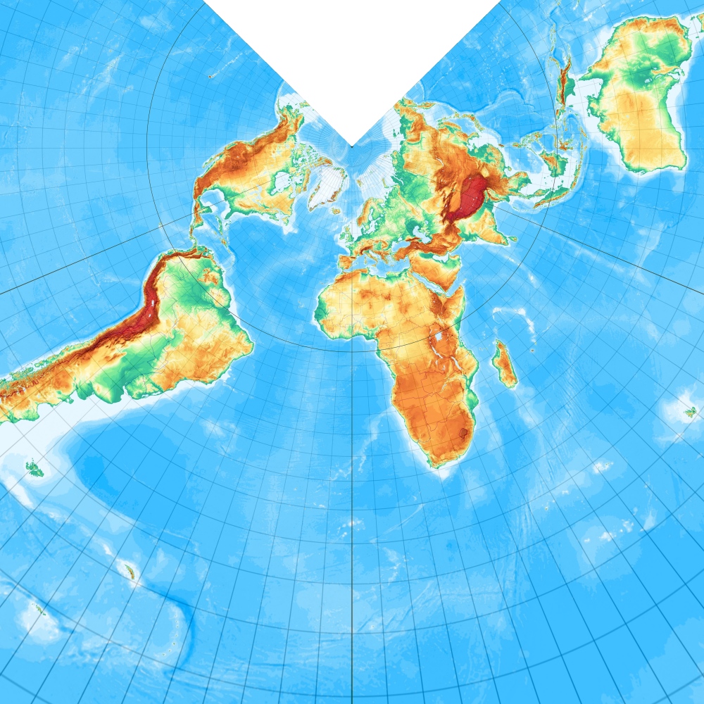 Häufig ist auch der Alberssche flächentreue Kegelentwurf aus dem Jahr 1805 anzutreffen, der zwei Parallelkreise (hier 15° und 75°) längentreu abbildet [Entwurf 4]. Equal-area Conic with two standard parallels or Albers Equal-area Conic (1805):