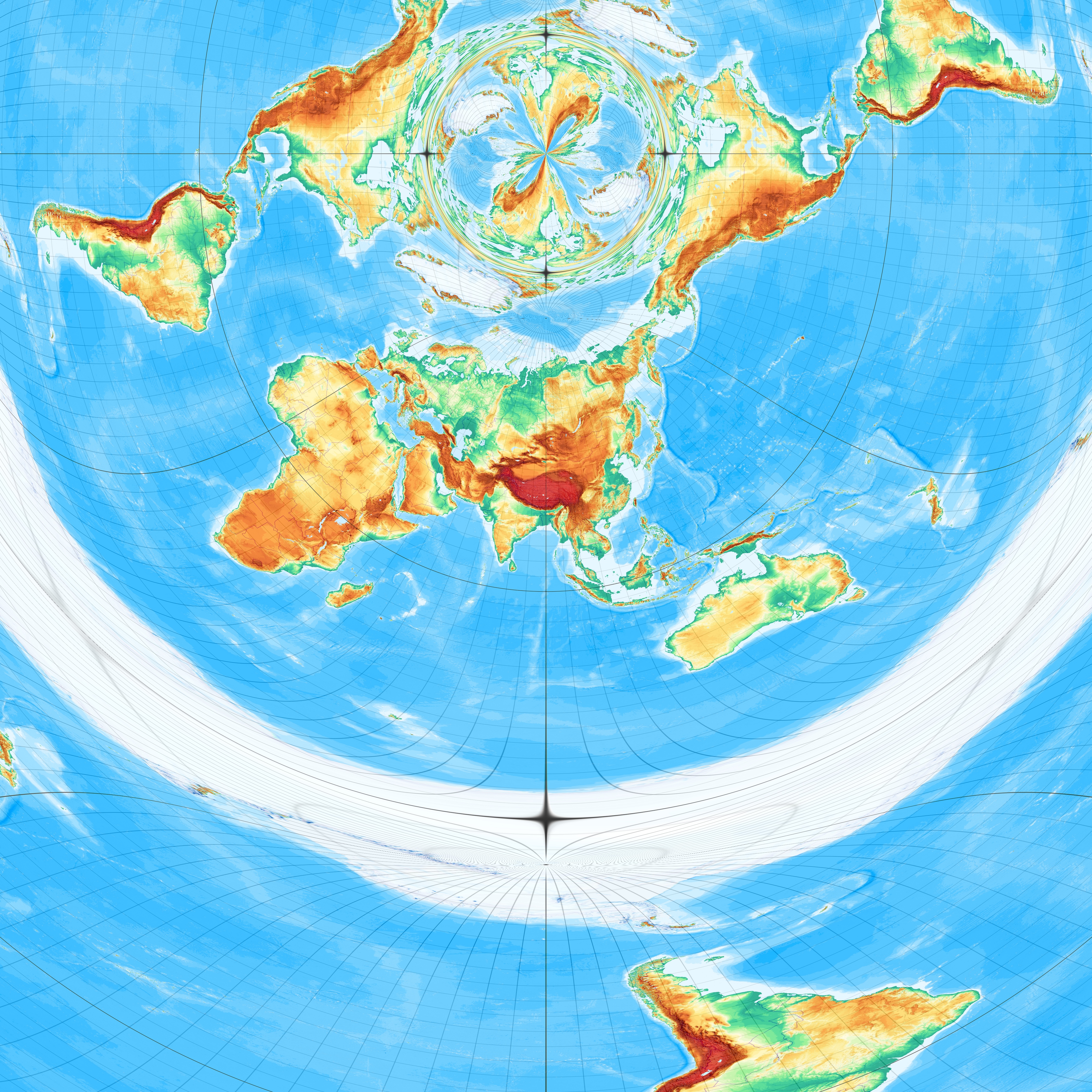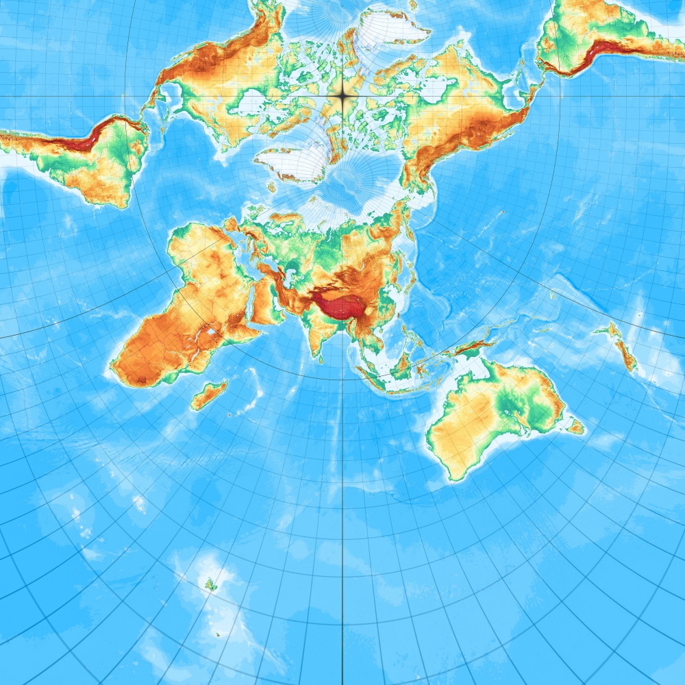 Der Entwurf lässt sich auch so ausführen, dass der Pol zu einem Punkt wird, was allerdings kaum genutzt wird. [Entwurf 1a nach Wagner]. Equidistant Conic with one standard parallel, pole as point: