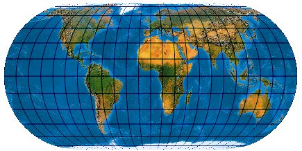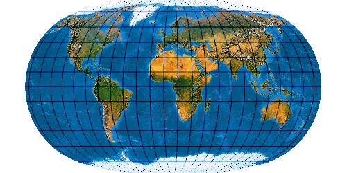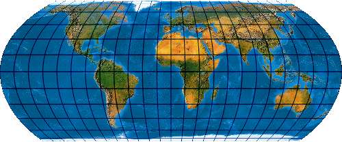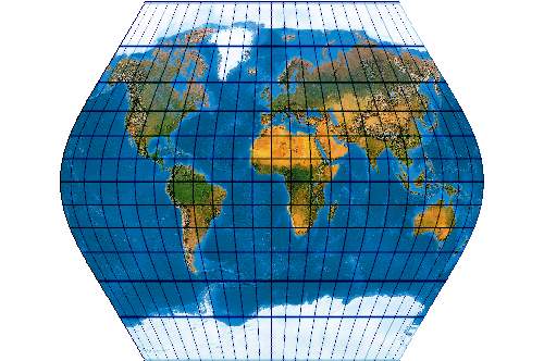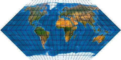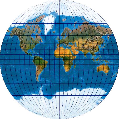 (Anmerkung: Das Netz hat ganz leicht durchgebogene Parallelkeise und gehört deswegen genau genommen gar nicht hier auf die Pseudozylinder-Seite.)