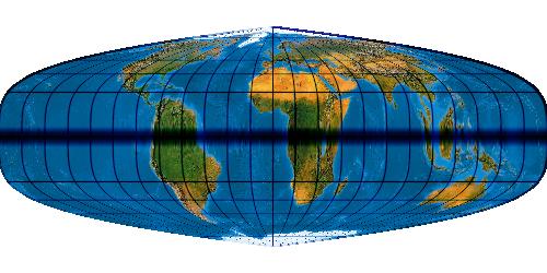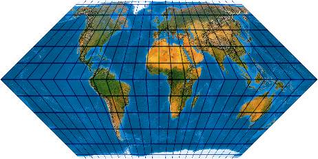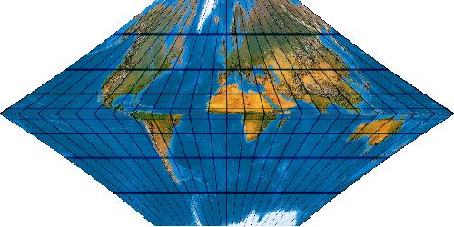 Ein gewichtetes Mittel aus abstandstreuem Zylinderentwurf (quadratischer Plattkarte) und Mercator-Sanson. Es handelt sich im Prinzip um den Tobler-Foucaut (1862), allerdings ist bei jenem das Mischungsverhältnis mit 50:50 fest und hier variabel. Hier einmal eine Mischung mit 75 % Mercator-Sanson