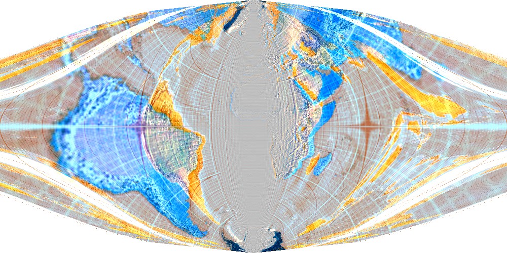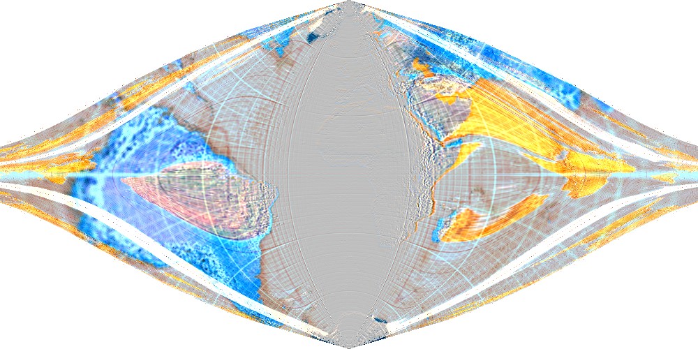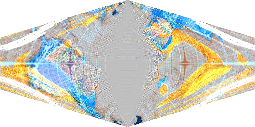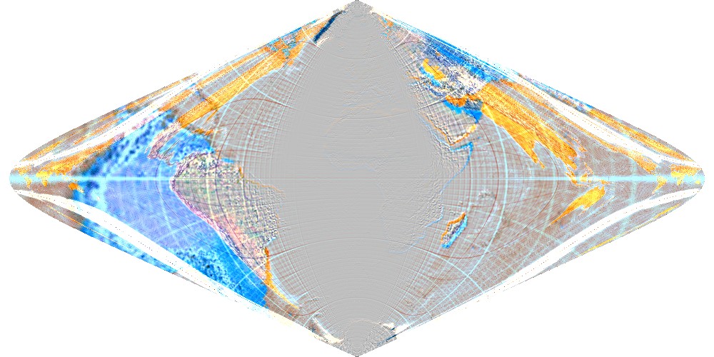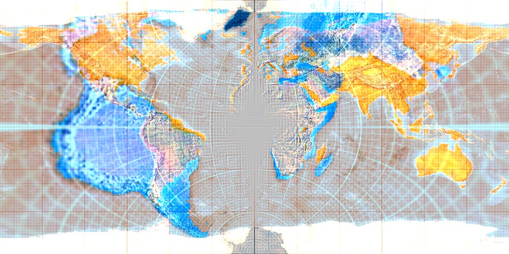 Absolutglied, Fehler der Approximation „nullter Ordnung“. Am Kap der Guten Hoffnung und an Madagaskar sind deutlich Lageunterschiede auszumachen. In Brauntönen deutlich erkennbar: Die Gitternetzlinien der quadratischen Plattkarte ...