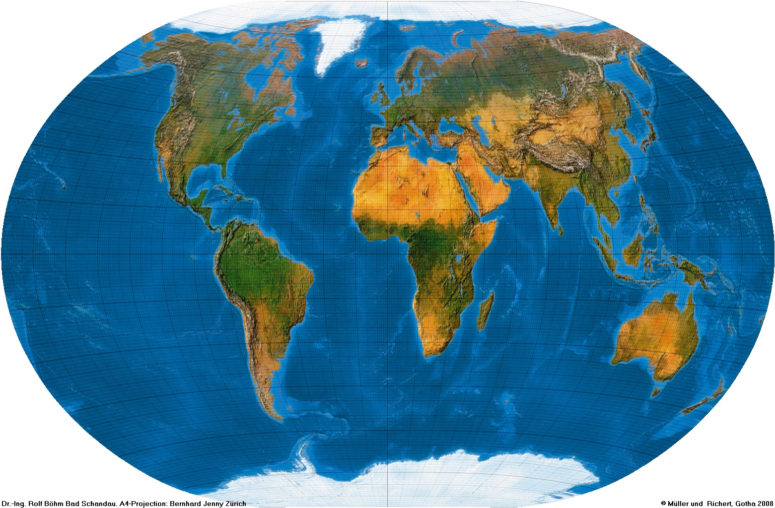 Zylinderentwurf und einem Mercator-Sanson variiert. Jenny rechnet mit einem n-Wert von 0,5.