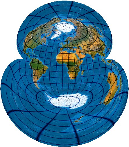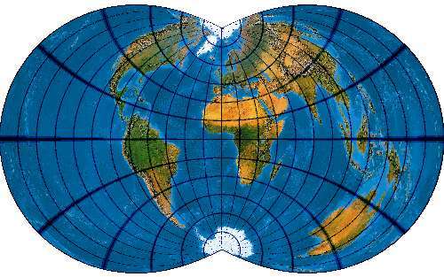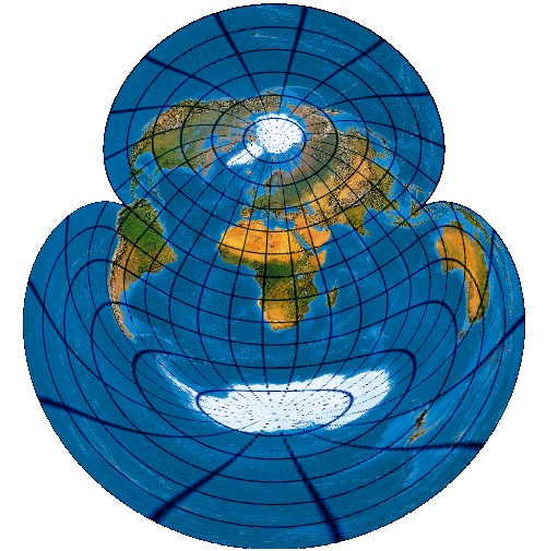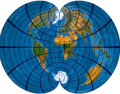 Auf Carlos A. Furutis Webseite fand ich eine generalized, transverse polyconic projection, die mich faszinierte. Die musste ich haben! On Carlos A. Furutis Webpage I found a generalized, transverse polyconic projection. What a famous Earth image! That I must have in my collection.
