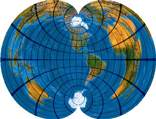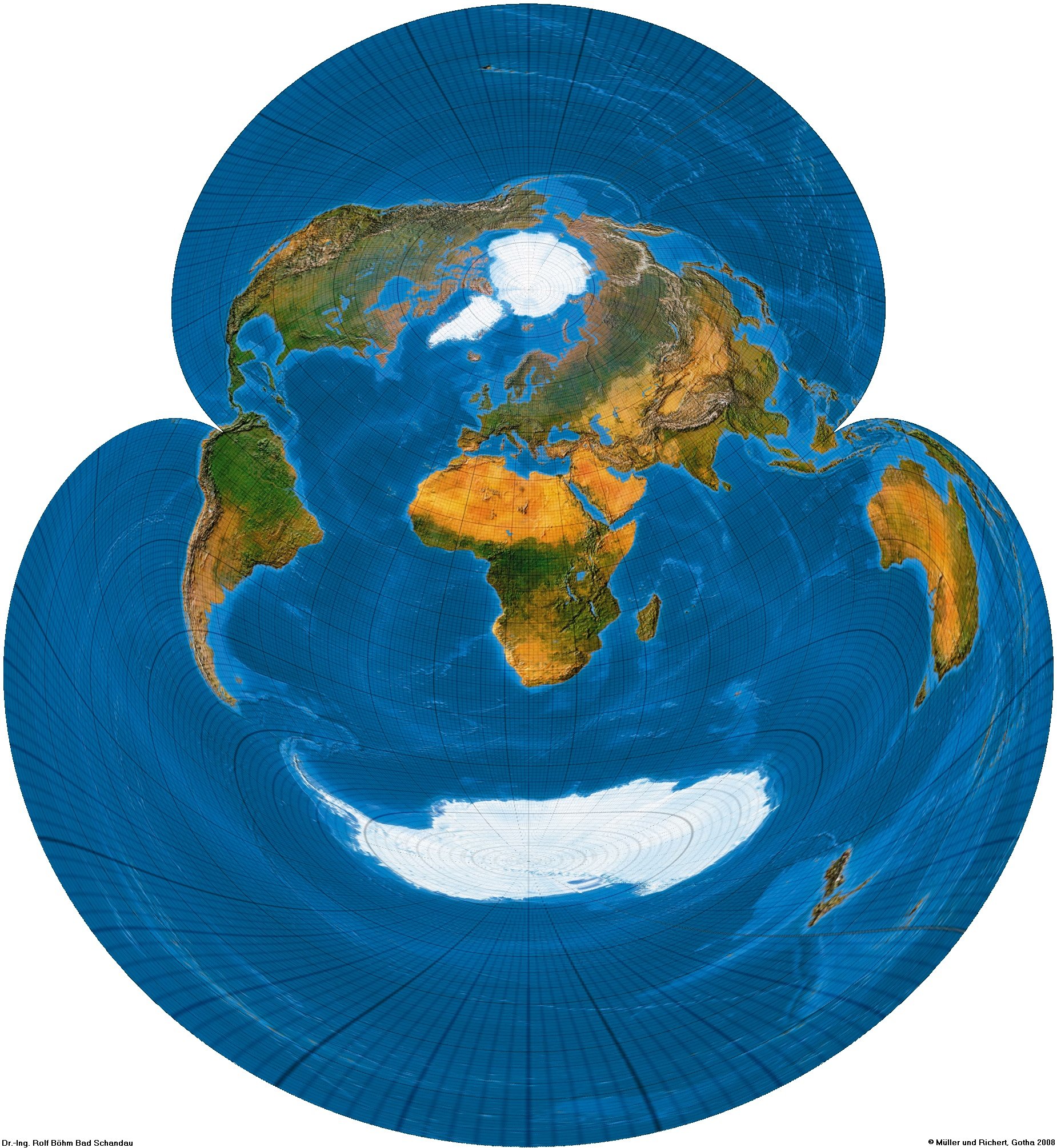 Wenn man die Parameter etwas anders wählt, wird der Äquator zum Aussenrand und es ergibt sich ein noch schöneres Erdbild. Here my own version with the equator as map border: