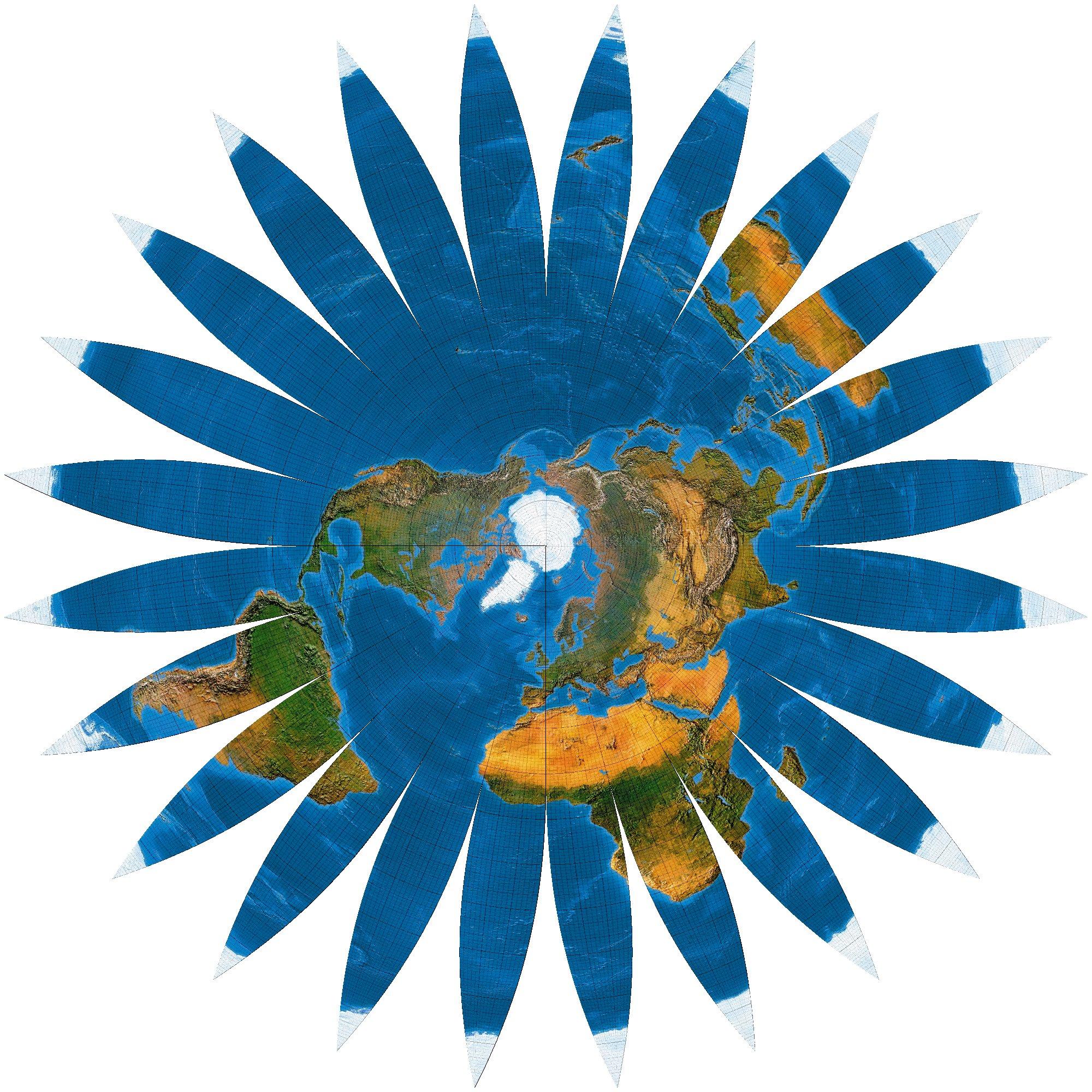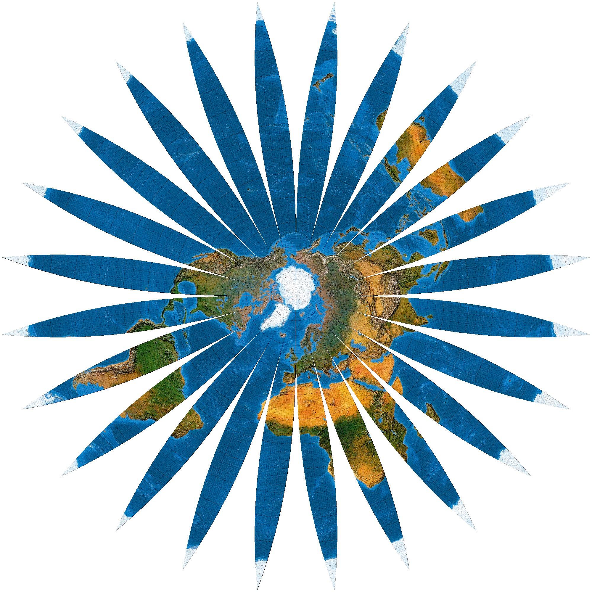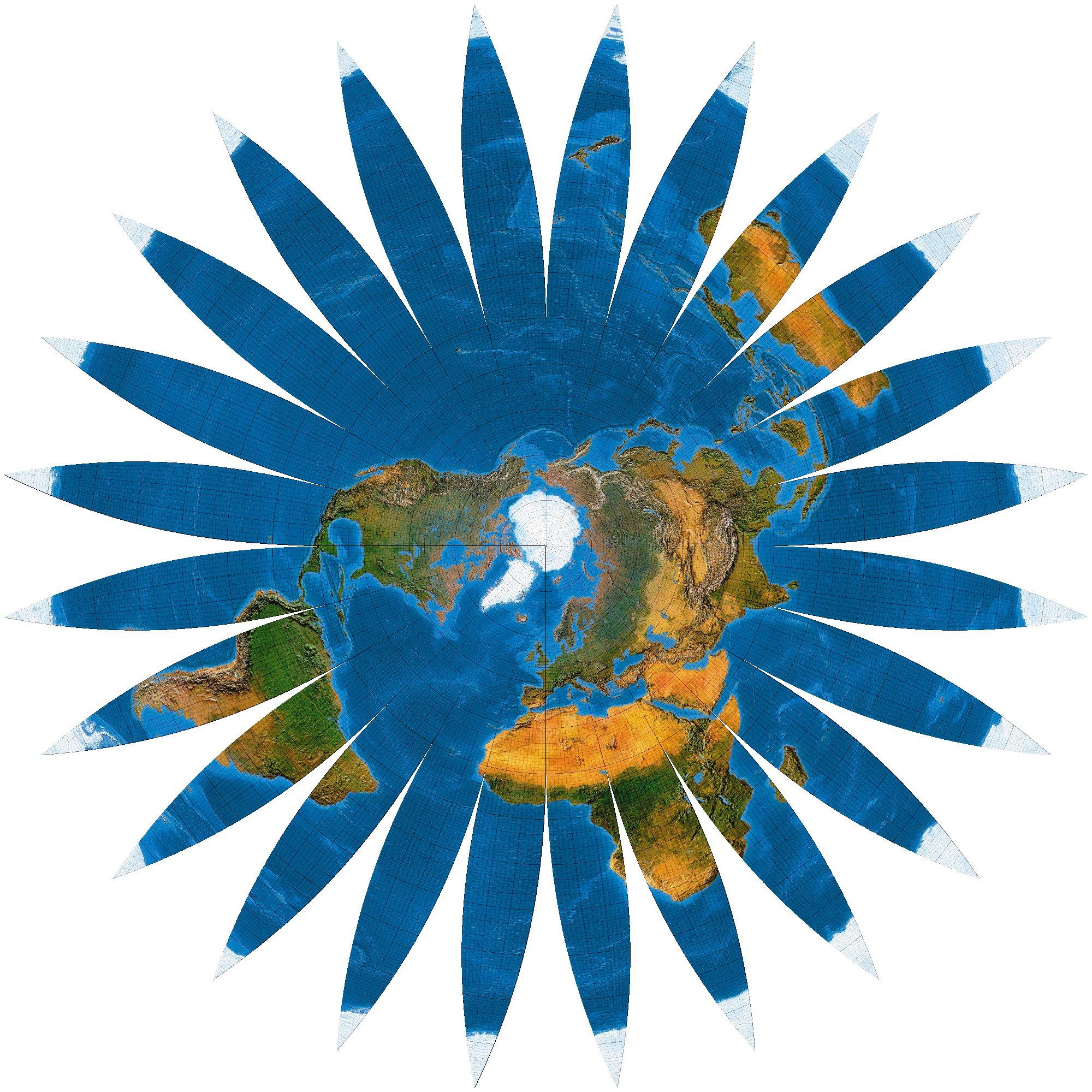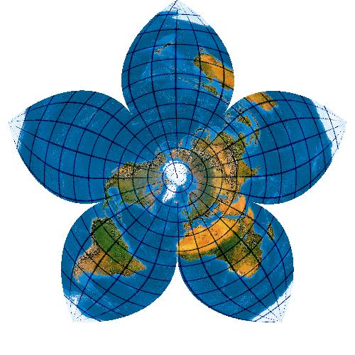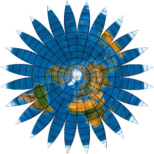 Zeichnerisch ist das Bildungsgesetz des Netzes kein Problem: Die Parallelkreise werden abstandstreu, also in ihrer wahren Länge, aufgetragen. So erhalten zugleich die mehrfachen Süpole ihre Positionen, nämlich im doppelten Abstand Nordpol-Äquator vom Zentrum. Die Meridiane laufen vom Nordpol zum Äquator, knicken dort und führen weiter zu den Sternspitzen ...
