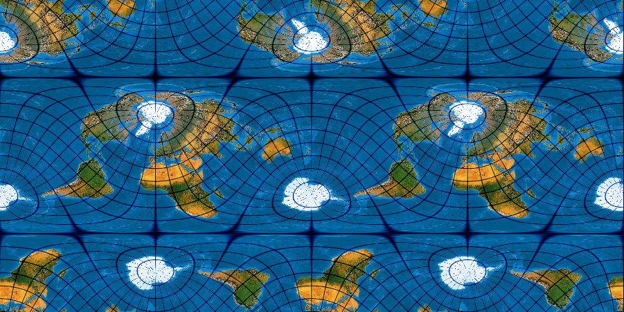 Eine geometrisch transformierende Software benötigt irgendeine Zielgeometriedefinition und Vimage holt sich diese aus dem Sekundäroperanden (Bild 8). Hier muss sich bei der Metatransformation die Erde selbst befinden, denn man projiziert ja von der Erdkugel wieder auf die Erdkugel. Mehrfache "Erdumläufe" à la Badezimmerfliesen sind ein Hinweis dafür, dass sich eine "Kartenebene" mit z. B. 1800 x 1800 Pixeln in Bild 8 befindet. In diesem Fall ist die Software stur und rechnet 5 Erdumläufe von 0 bis 1800 Grad durch ... und das ist ein Fall für die Designabteilung von Villeroy & Boch.