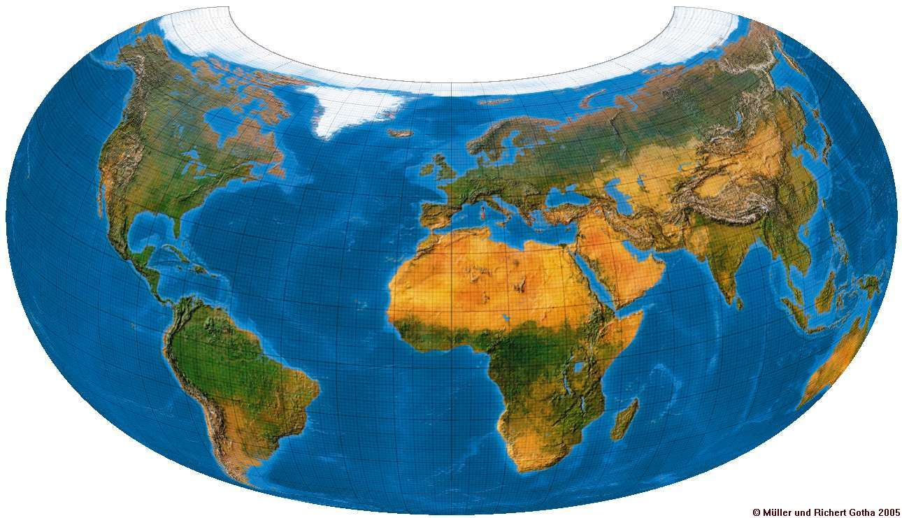 Eine ganz andere Ansicht der Erde liefert der Armadillo von Erwin Raisz (auch Orthoapsidalprojektion genannt), der die Erde als „aufgeschnittene Apfelsinenschale“ zeigt.