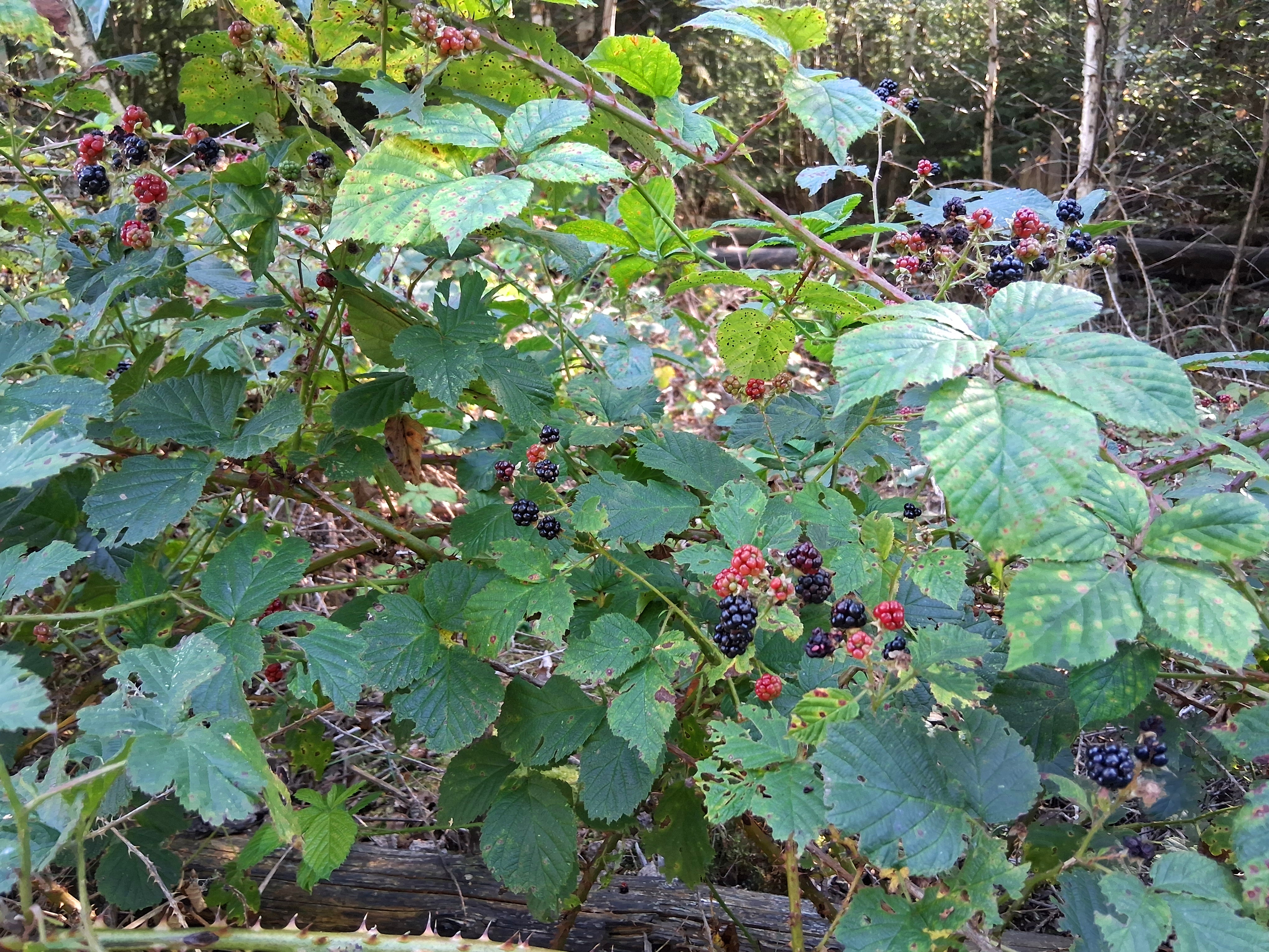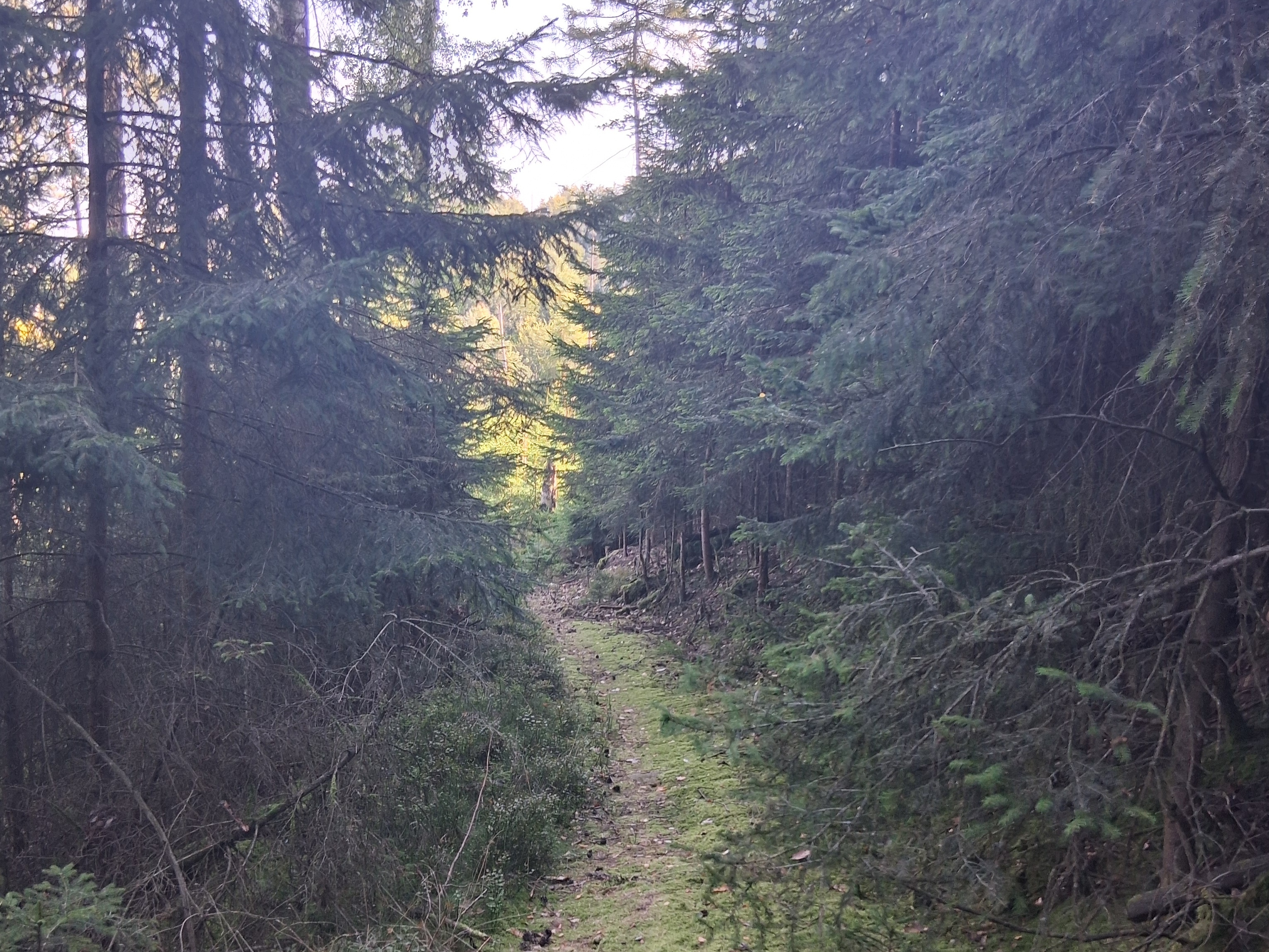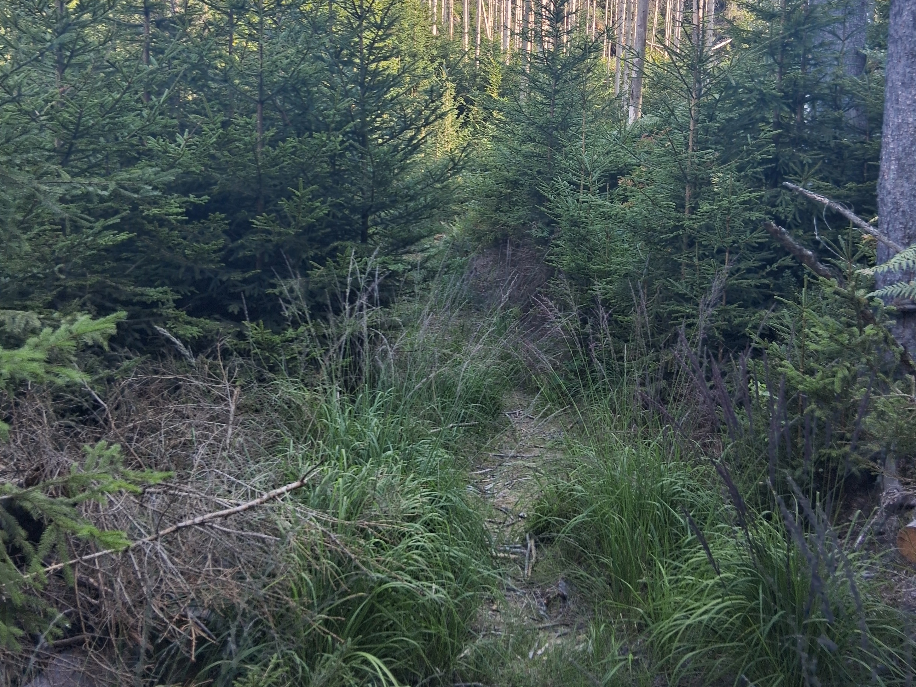 Unser Weg ist eigentlich der theoretisch gerade weiterführende Brombeerweg, gerade über die Wegkreuzung Weg 1884/Fischers Loch/Brombeerweg/Buchberg- oder Bußbergweg❺ hinwegführend, doch hinter der Kreuzung fehlen etwa 20 m Freischnitt. Die dort noch liegenden Stämme täuschen ein Wegende vor, durch das man sich eigentlich gerade weiter durchkämpfen müsste. Doch besser ist es, zunächst an der ❺ halblinks (in Fischers Loch) einzubiegen, kurz danach bei ❻ (kleines Triangel) scharf rechts, was uns schließlich wieder bei der ❼ linksabbiegend auf dem Weg (was nun der Brombeerweg ist) zurückführt. Was auf der Karte ganz einfach aussieht, ist im Gelände sehr unübersichtlich. Es überrascht, wie man sich auf nur 30×30 Metern verlaufen kann. In der Wildnis muss man eben nicht nur durchkommen, sondern auch die Orientierung behalten.