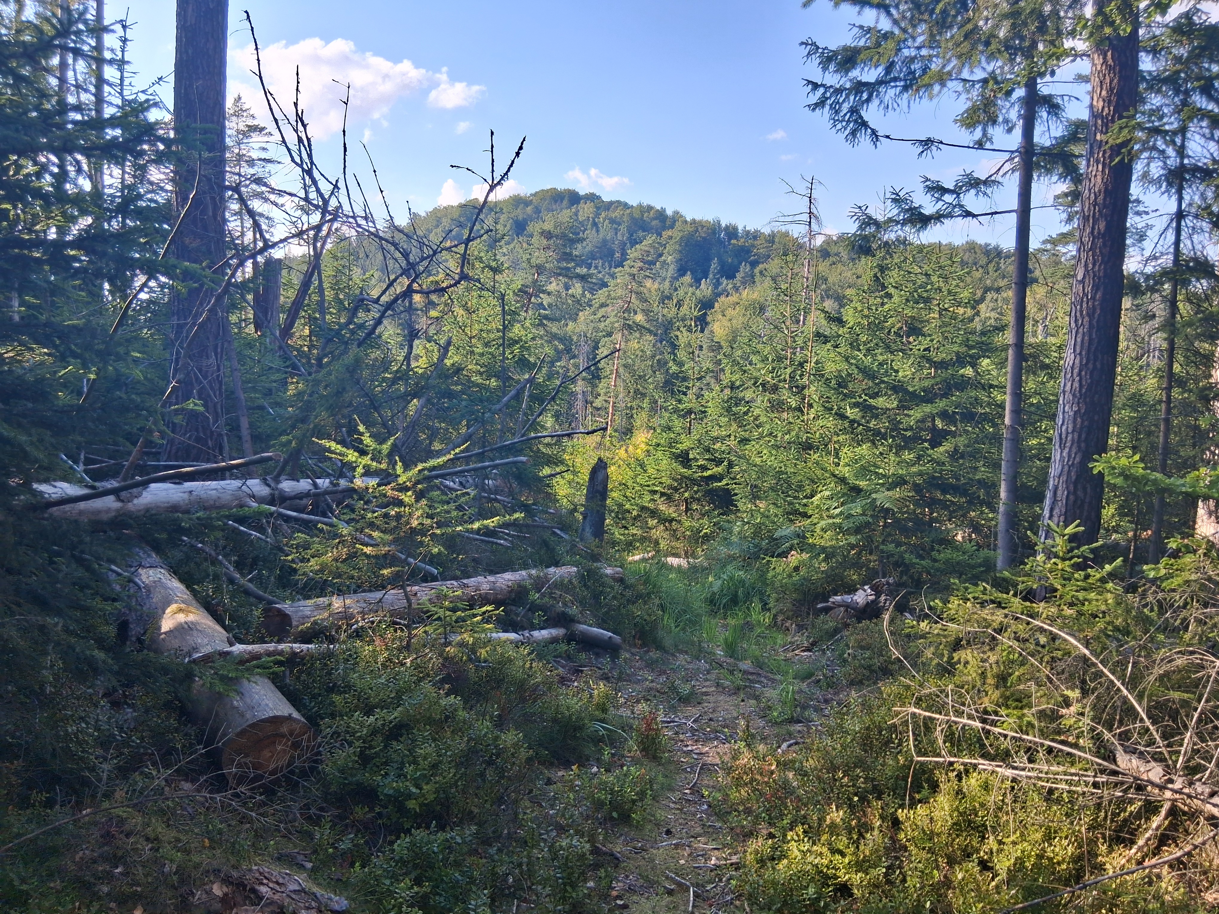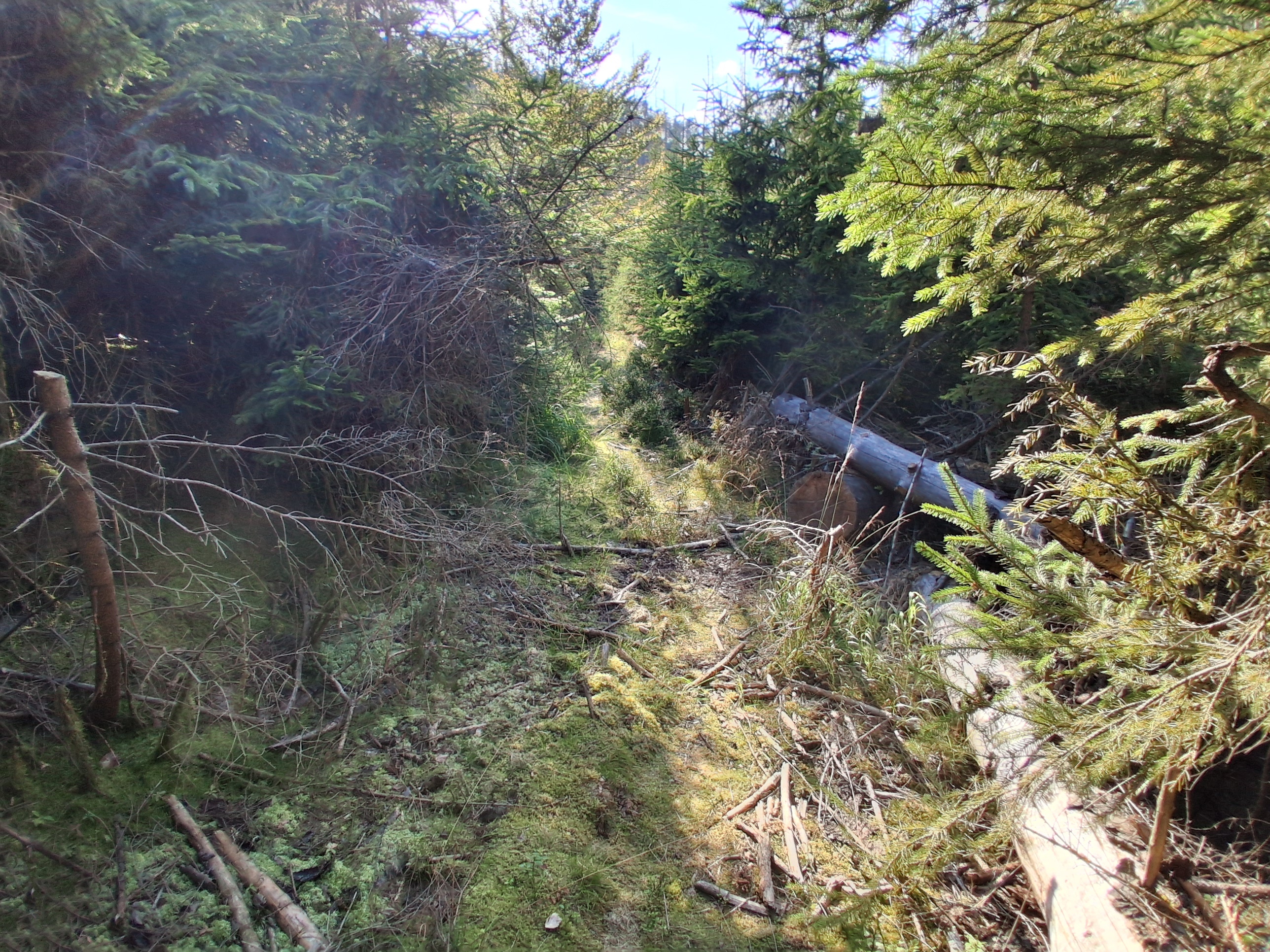 Die von den Waldarbeitern durchgesägten Stämme am Wegrand sind eine wertvolle Orientierungshilfe.