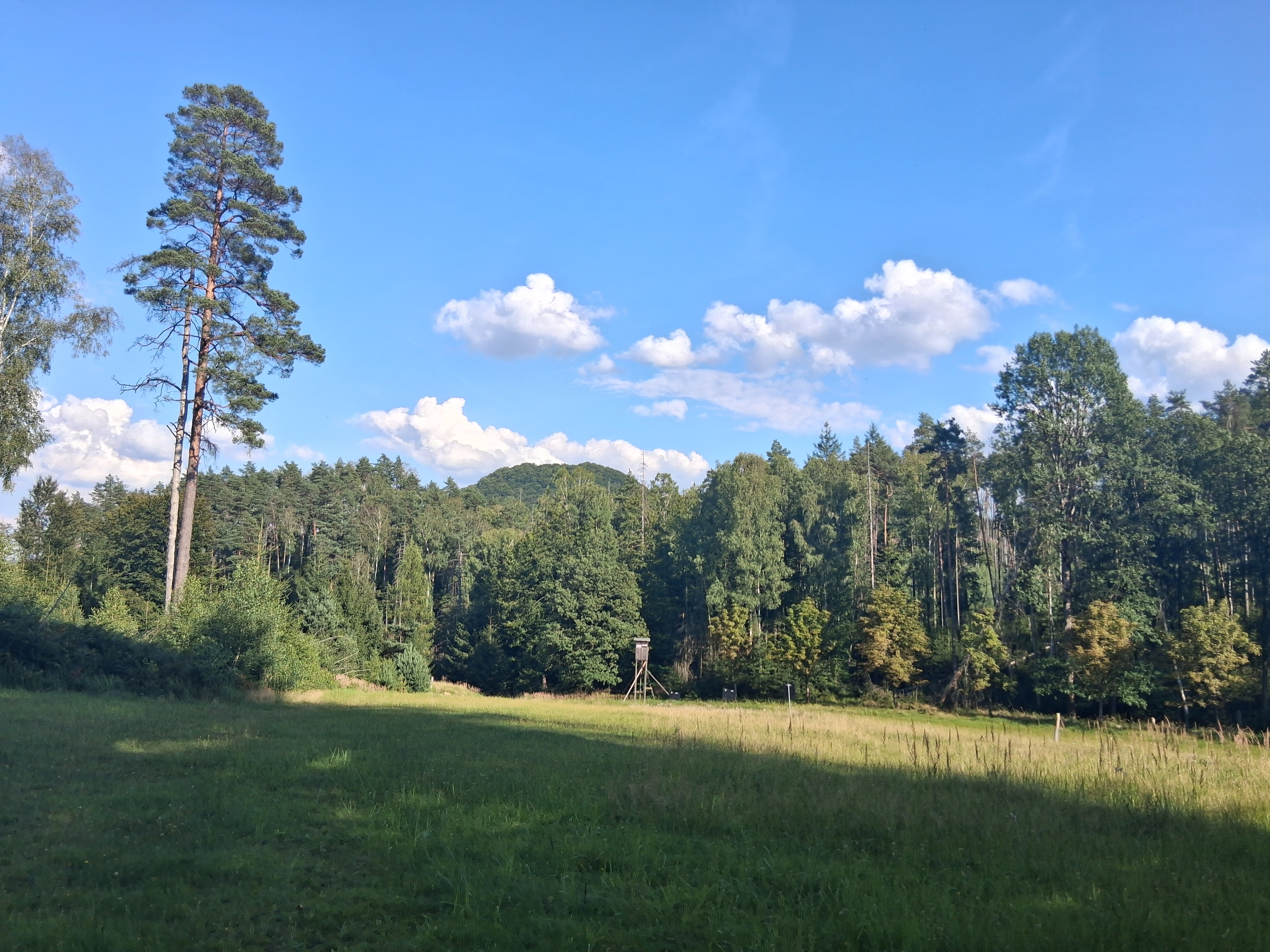 Doch das ist nicht ganz richtig, denn hier fängt unser Weg an ❶. Der Weg führt halbrechtshaltend (Richtung Nordwest) über die Wiese, an einem Anstand vorbei und steigt dann allmählich zum Höhenrücken Försters Ebene leicht an. Wenn man zurück blickt, sieht man im Hintergrund den Raumberg: