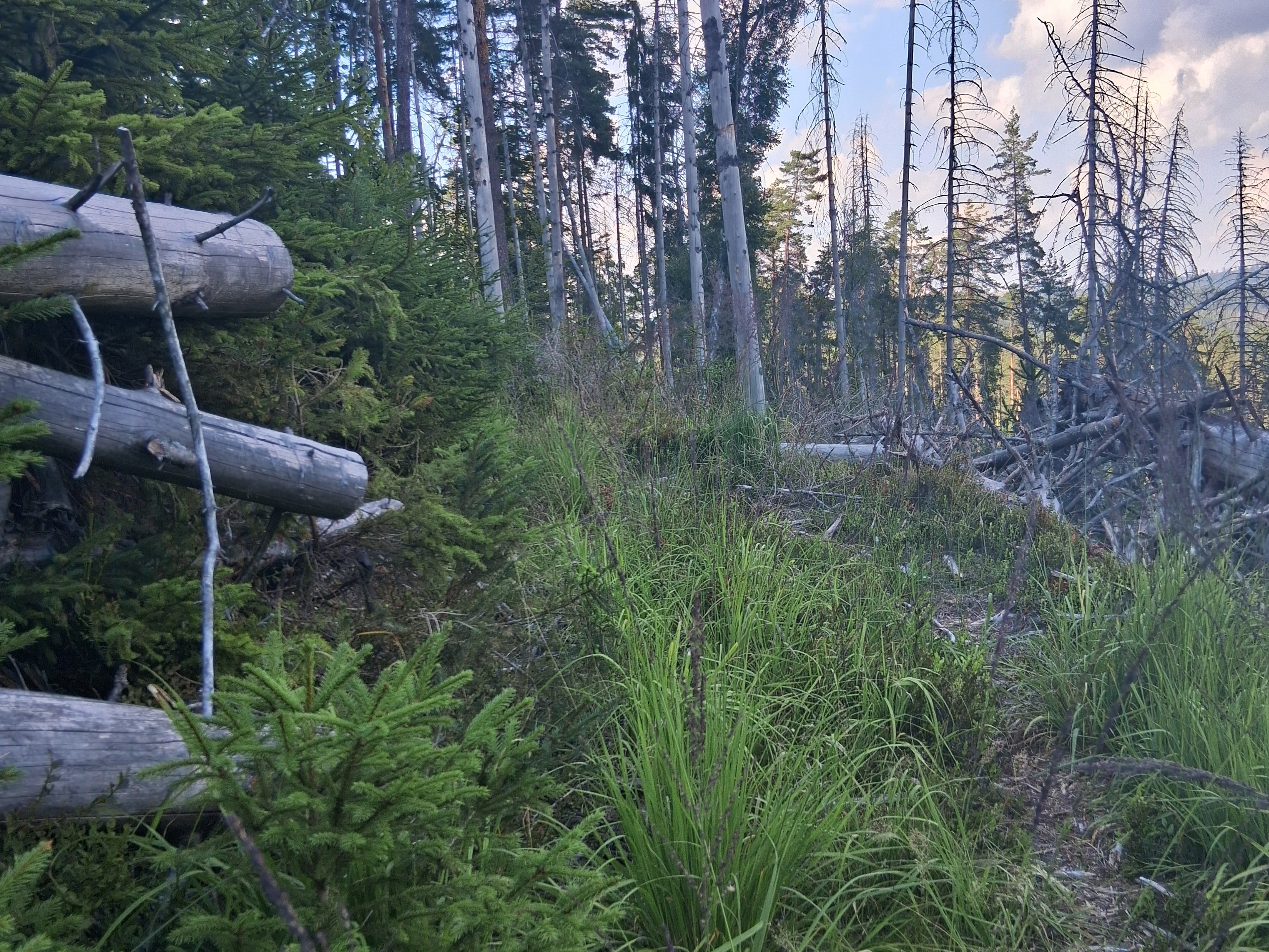 Ein ganz herzliches Dankeschön geht an die Nationalpark- und Forstverwaltung. Die haben die ganzen Baumstämme durchgesägt – sog. motormanuelles Freischneiden. Wer einmal einen solchen Stamm mit Handsäge durchgesägt hat, weiß Technik zu schätzen. Der Weg wurde natürlich nicht freigeschnitten, um einen schönen Hauptwanderweg zu schaffen, sondern damit die Feuerwehr im Brandfall in den Wald hineinkommt. Deshalb gibt es hier auch keine Wegsicherungspflicht. Der Weg ist ja auch nur ein ganz wilder schmaler Pfad. Wir Wanderer freuen uns aber sehr, dass der Weg nun für einige Jahre wieder sehr gut bewanderbar sein wird.