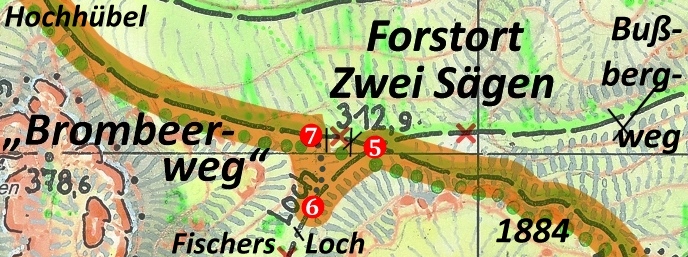 Noch irreführender ist es übrigens in der Gegenrichtung: Wenn man vom Hochhübel kommend nicht aufpasst, vor den Querliegern am Ende des Brombeerweges bei ❼ nach rechts ausweicht und anschließend folgerichtig bei ❻ nach links auf den (überaus deutlich ausgeprägten) Bußbergweg einbiegt, und dabei nicht bedenkt, dass man nun nochmals bei ❺ vom Bußbergweg auf den an dieser Stelle völlig im Dickicht verborgenden Weg 1884 nach rechts abbiegen muss, wird man auf dem Bußbergweg bleiben, was eine völlig falsche Richtung ist.