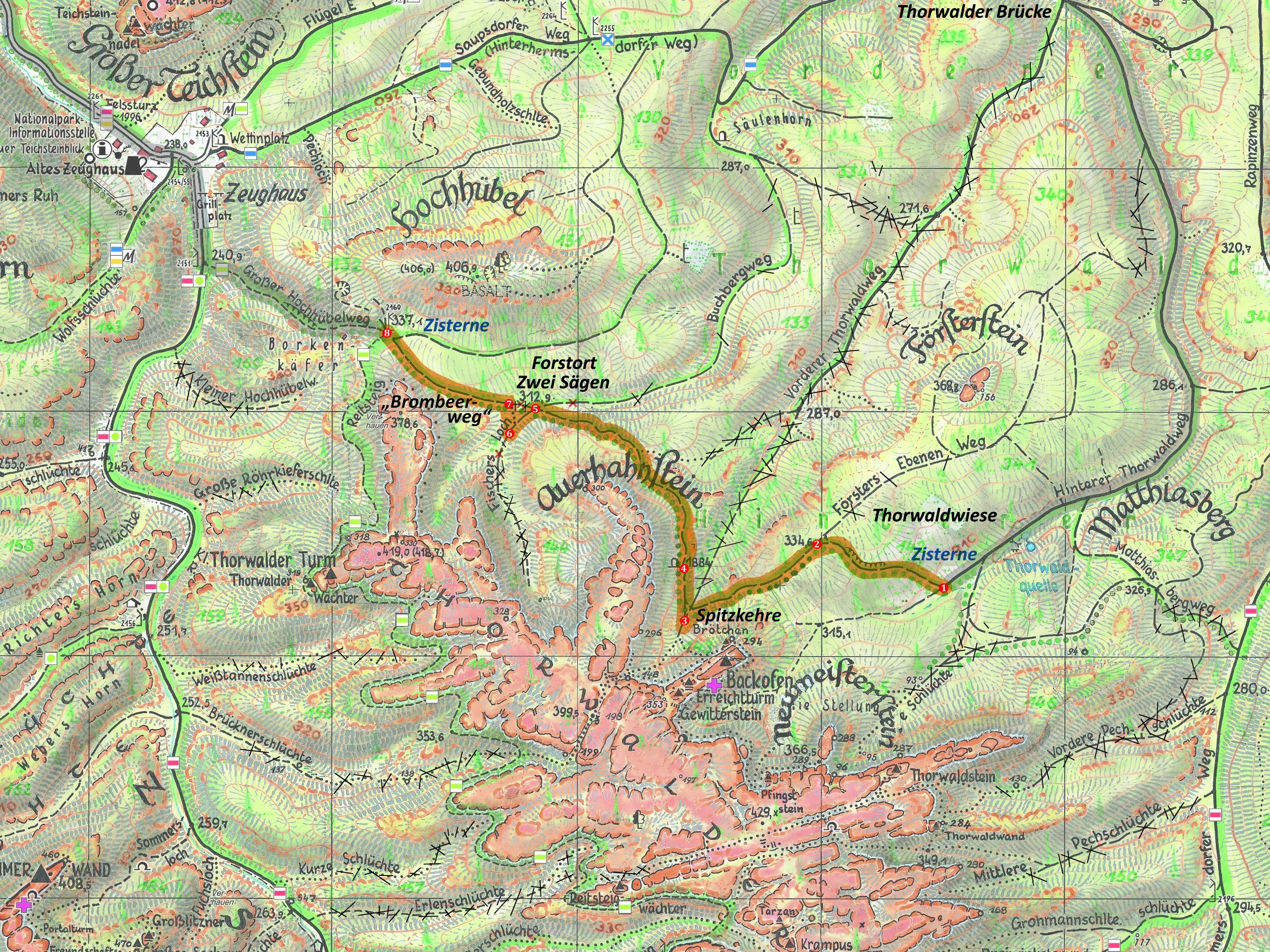 Der Weg hat keinen durchgehenden Namen, was daran liegt, dass er stückweise entstanden ist. Für das erste Stück bis Försters Ebene ist mir überhaupt kein Name bekannt. Der von Openstreetmap dort benutzte Name Hinterer Thorwaldweg ist wohl nicht ganz zutreffend, da der Hintere Thorwaldweg einst über die Thorwaldwiese gerade weiter führte und nicht abzweigt. Nach Erreichen von Försters Ebenen Weg könnte man unseren Weg, da er unter dem Backofen herum führt, Backofenweg nennen. An der Spitzkehre Vorderer Thorwaldweg führt er gemäß Felsinschrift als Weg 1884 weiter, wobei der eigentliche 1884er Wegebau wohl nur von der Spitzkehre bis zur Einmündung eines Weges verlief, der ab Vorderen Thorwaldweg ab Höhenpunkt 287,0 hinaufkam (vgl. Äquidistantenkarte 1:25000 1878/79). In meiner Karte ist dies der östlich Auerhahnstein einmündende punktierte Pfad. Der war 1980 noch deutlich erkennbar, ist mittlerweile aber fast völlig in Vergessenheit geraten, weshalb wir den Wegnamen Weg 1884 nun getrost bis Fischers Loch/Bußbergweg (Forstort Zwei Sägen) führen können. Der weitere Weg bis Reitsteig/Zisterne Großer Hochhübelweg ist der Brombeerweg. Dieser wird in alten Forstkarten als Teil des (1870 von OF Täger errichteten) Buchberg-/Bußbergweges geführt, was aber heute nicht mehr so wahrgenommen wird. Ich bedanke mich bei Ulrich Augst, Sebnitz für die übersandten Forstkartenscans. Man könnte den gesamten Weg auch Kernzonengrenzweg nennen, was aber etwas landschaftsfremd wirkt.