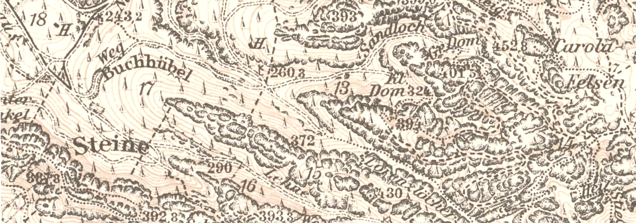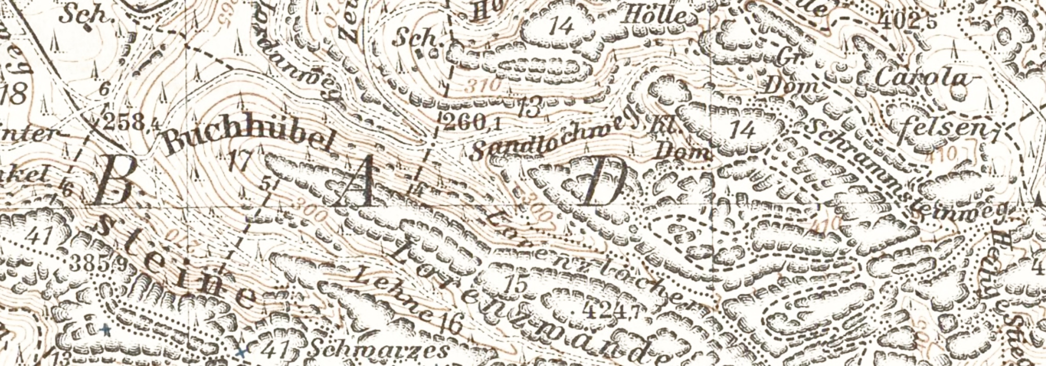 Diese, mir bis 2017 unbekannte Karte zeigt, dass es immer wieder Überraschungen gibt. Es dürfte dies die älteste großmaßstäbige Detailwanderkarte der Sächsischen Schweiz überhaupt sein. Äußerst wertvoller topographischer Bestandsnachweis von Wegen und touristischer Infrastruktur. Bemerkenswert auch, dass die Kartenaufnahme 1878 wohl noch ohne den Kenntnisstand der Äquidistantenkarte erfolgen musste (vermutlich war aber Oberreit bekannt, nicht auszuschließen Meilenblatt). Ich bedanke mich herzlich bei Heiko Hebestadt für den Hinweis auf die Karte und den ausgezeichneten Scan, den er mir übersendet hat.