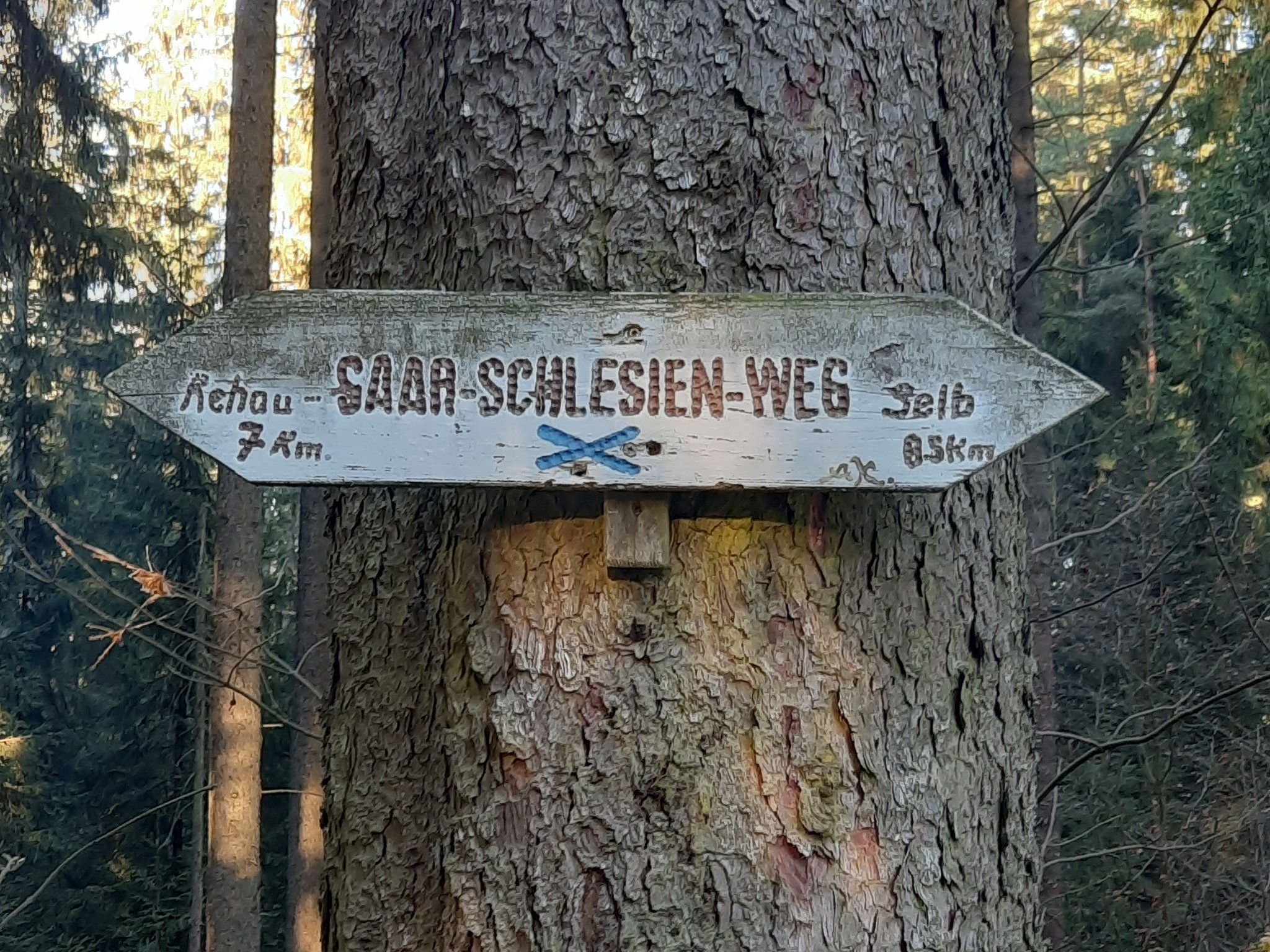Saarschlesische Wanderweg mit kleinen blauen Andreaskreuzen markiert und lässt sich so ausgezeichnet