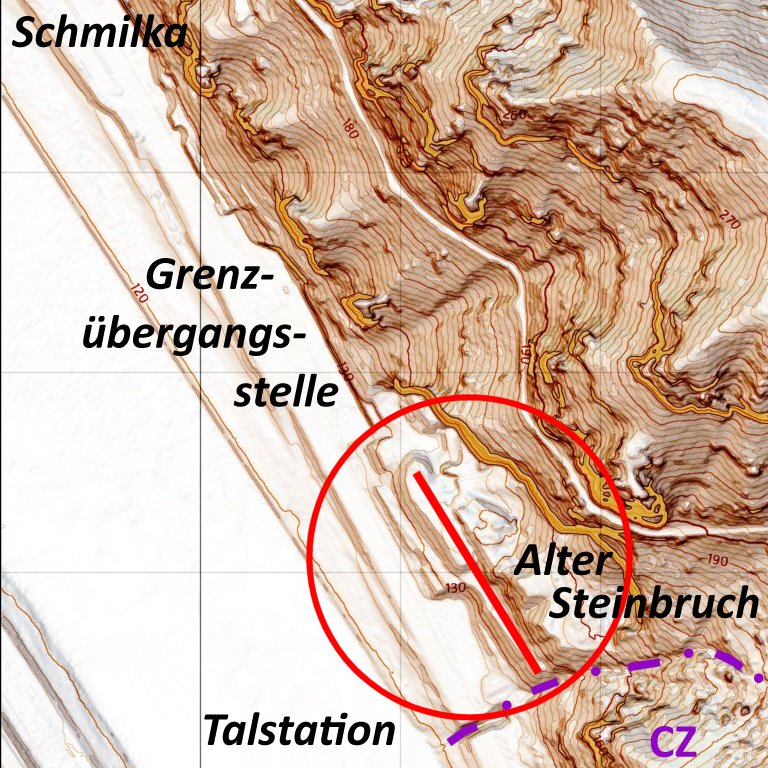 Hier gibt es eine interessante Lösung. Direkt an der Landesgrenze, etwas südlich der alten Grenzübergangsstelle, befindet sich ein altes aufgelassenes Steinbruchgelände: