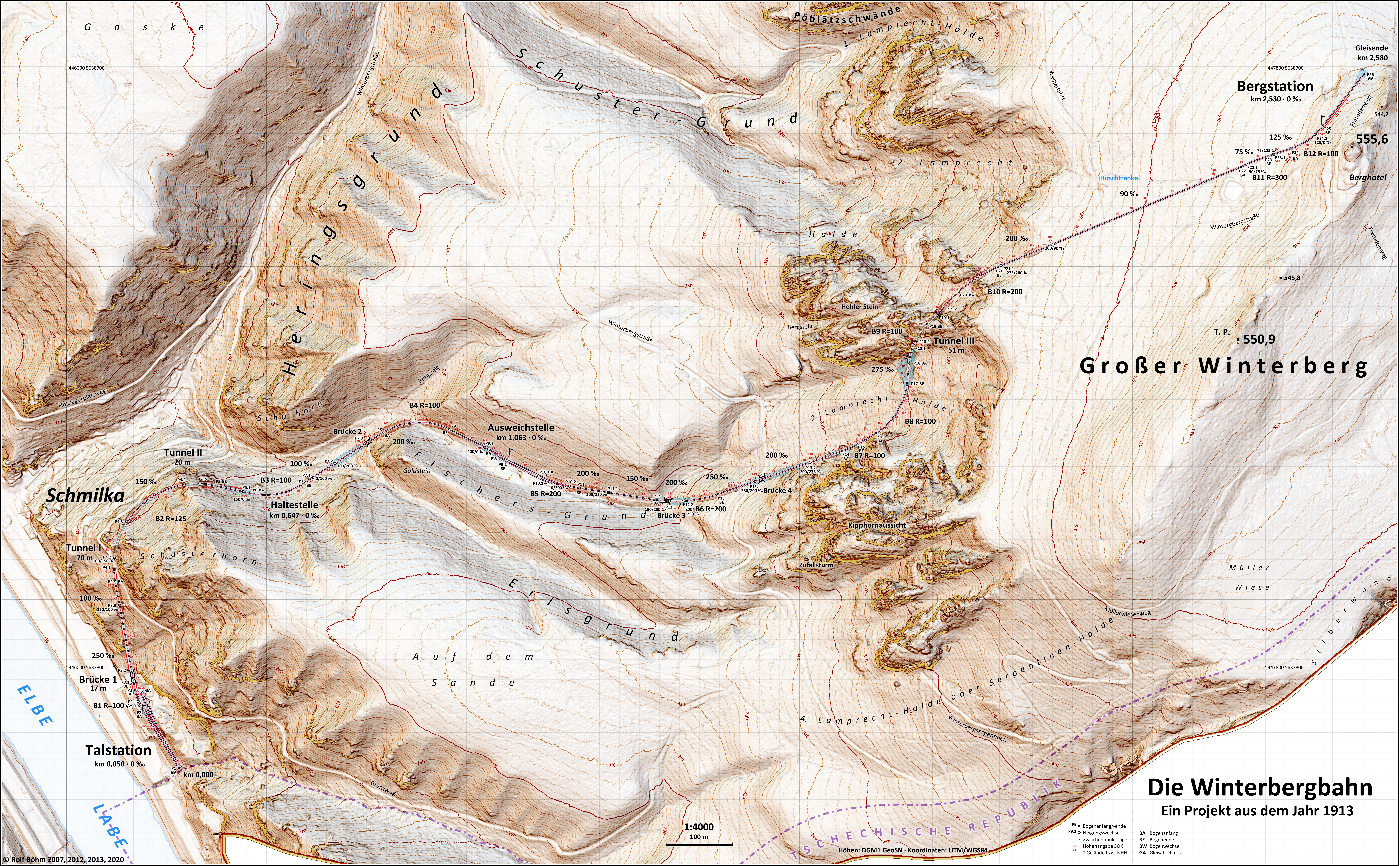 Ein Projekt hat mir keine Ruhe gelassen: die um 1913 ***) angeregte Bergbahn auf den Großen Winterberg. Gewiss hätte eine (am Ende noch elbquerende) Seilbahn auf den Lilienstein das Landschaftsbild stark entstellt. Aber gilt das auch für eine Zahnrad- oder Standseilbahn im Wald? Wäre es damals zu einer Realisierung gekommen – heute wäre dies gewiss eine touristische Attraktion allerersten Ranges. Über die vermeintliche „Landschaftsverschandelung“ wäre längst Gras gewachsen, ähnlich wie bei den Dresdner Bergbahnen, die zunächst auch als Brachialeingriff galten (vgl. Wagner: Dresdner Wanderbuch, Dresden 1934), heute hingegen ein Schatz sind. Eine andere Frage ist natürlich die nach der technischen Ausführbarkeit. Hier der Versuch einer Rekonstruktion.