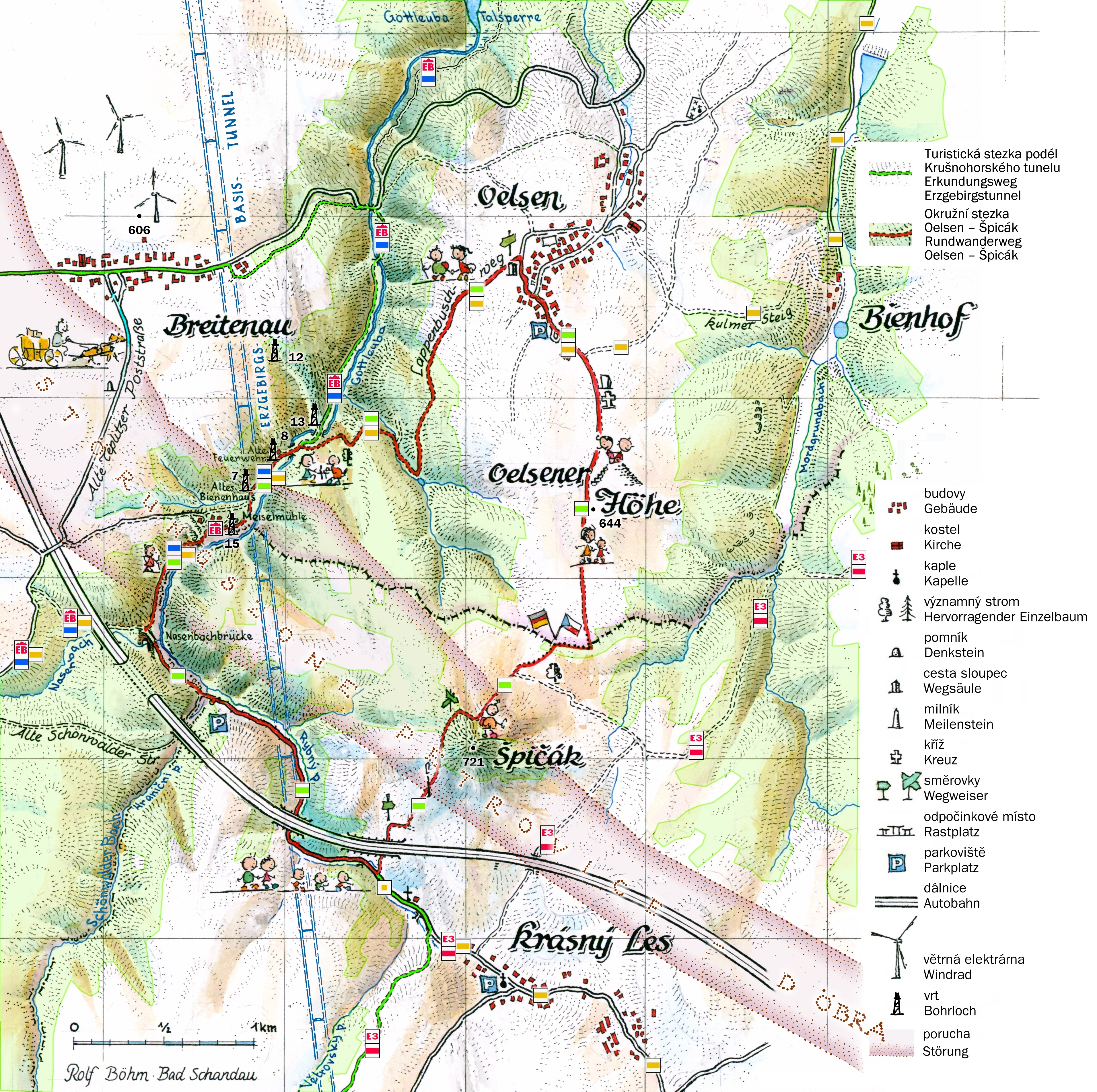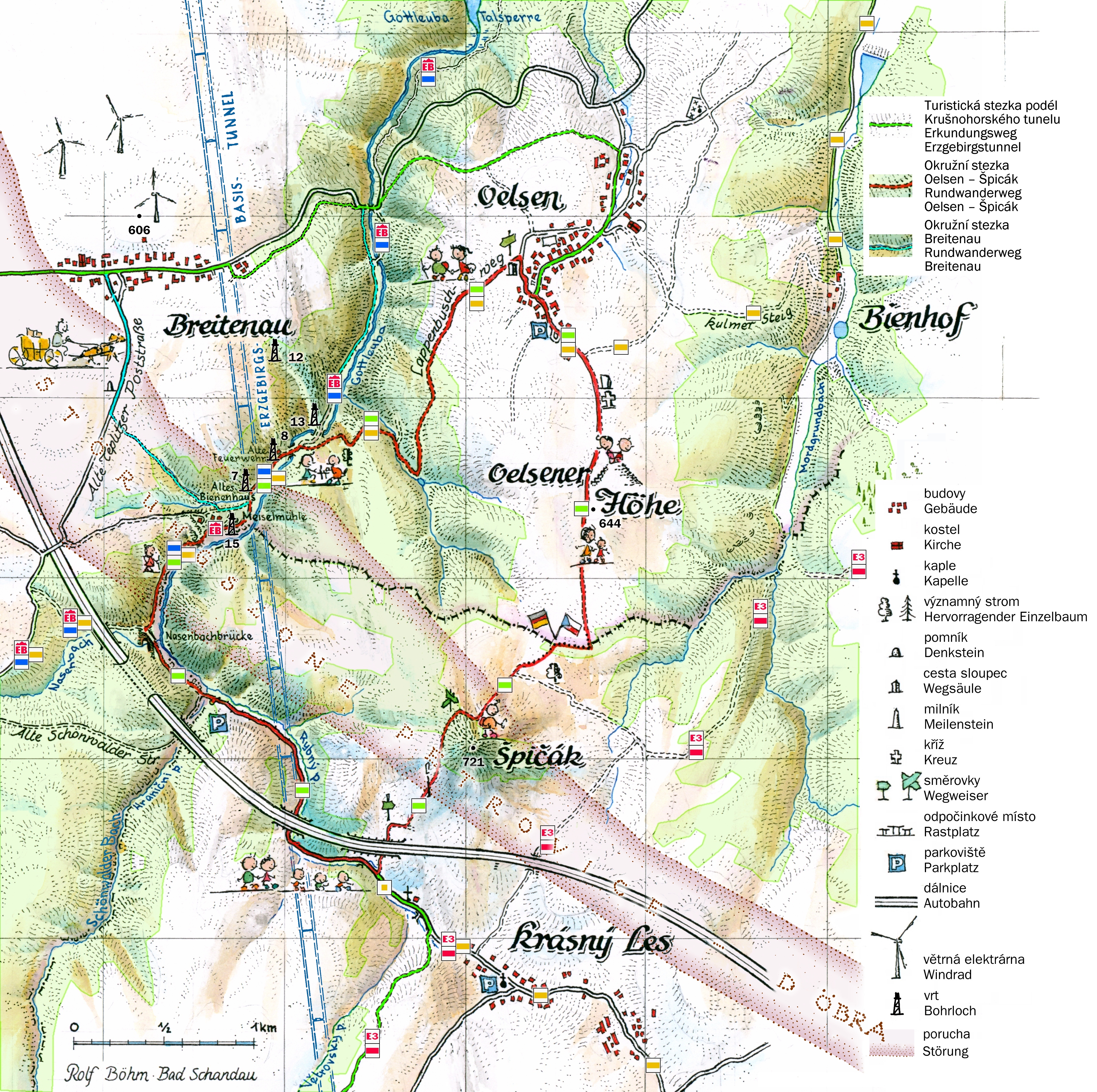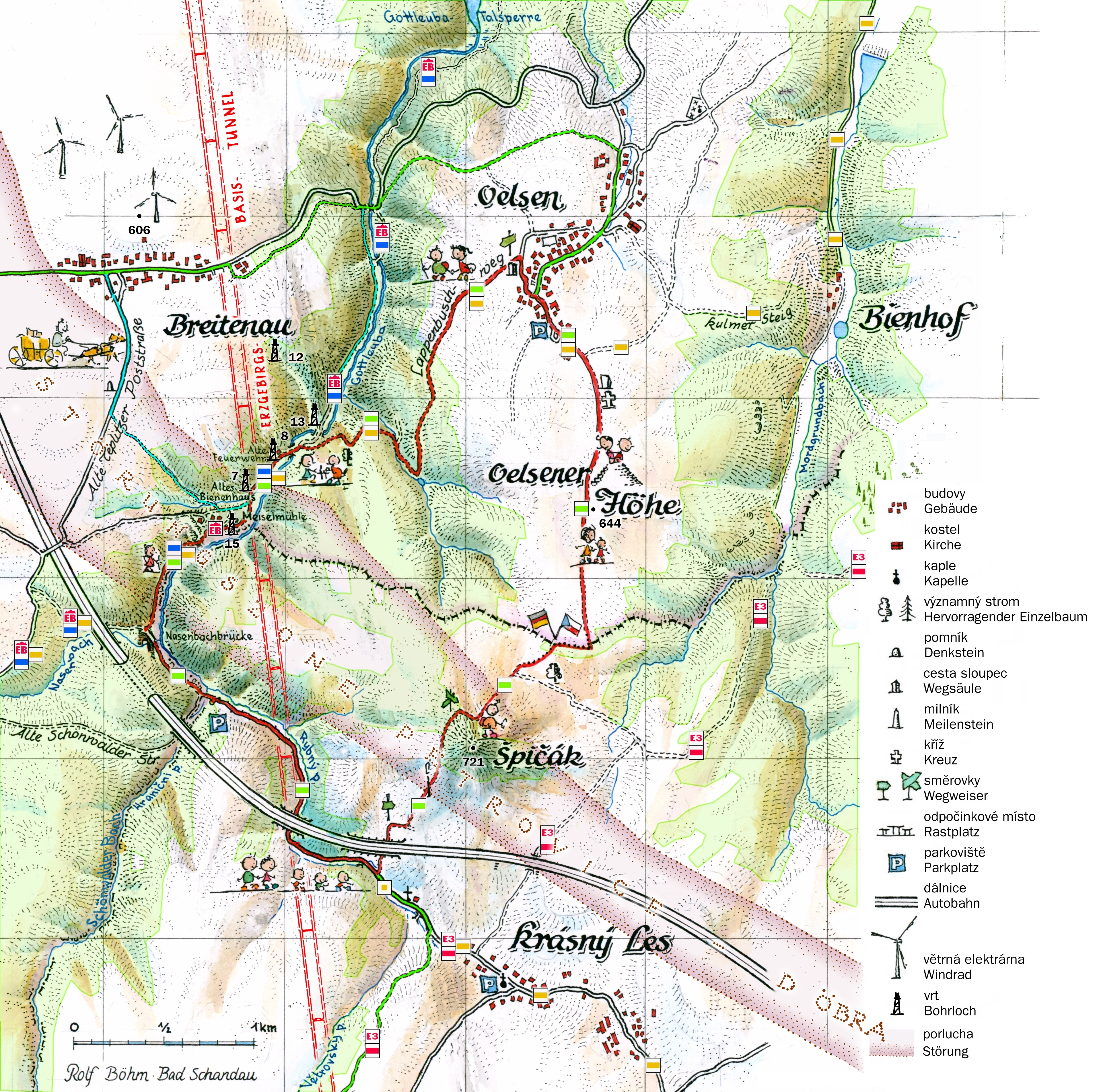 Neu 21.08.2025: Tunnel blau, Rundweg Breitenau entfernt, konsequenterweise aus Hauptweg die Nordschleife Oelsen herausgenommen (die ohne Rundweg Breitenau eine unnötige Wegverlänrerung darstelen würde), Wegerläuterung 2 Wege dt/cz in Legende