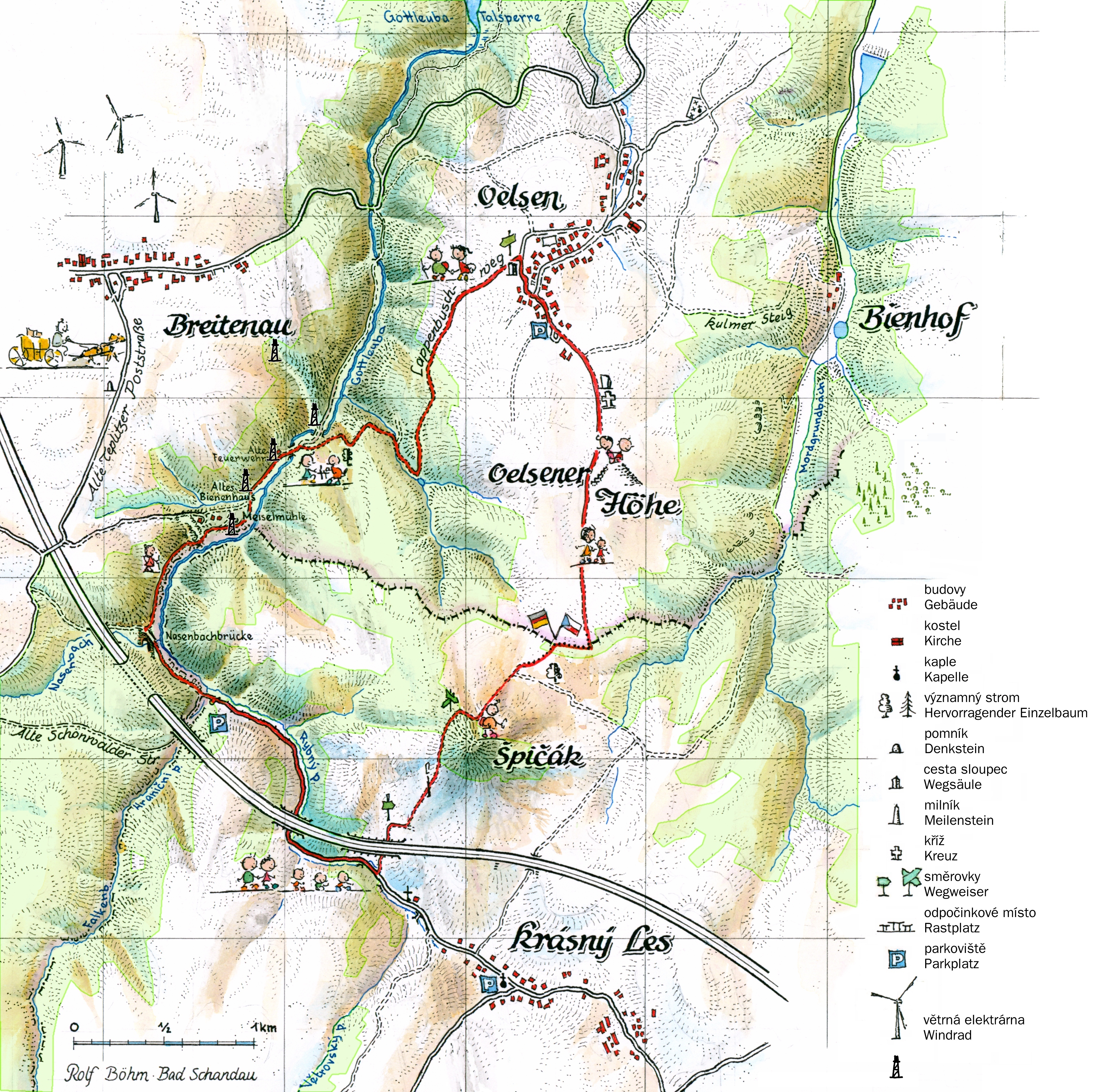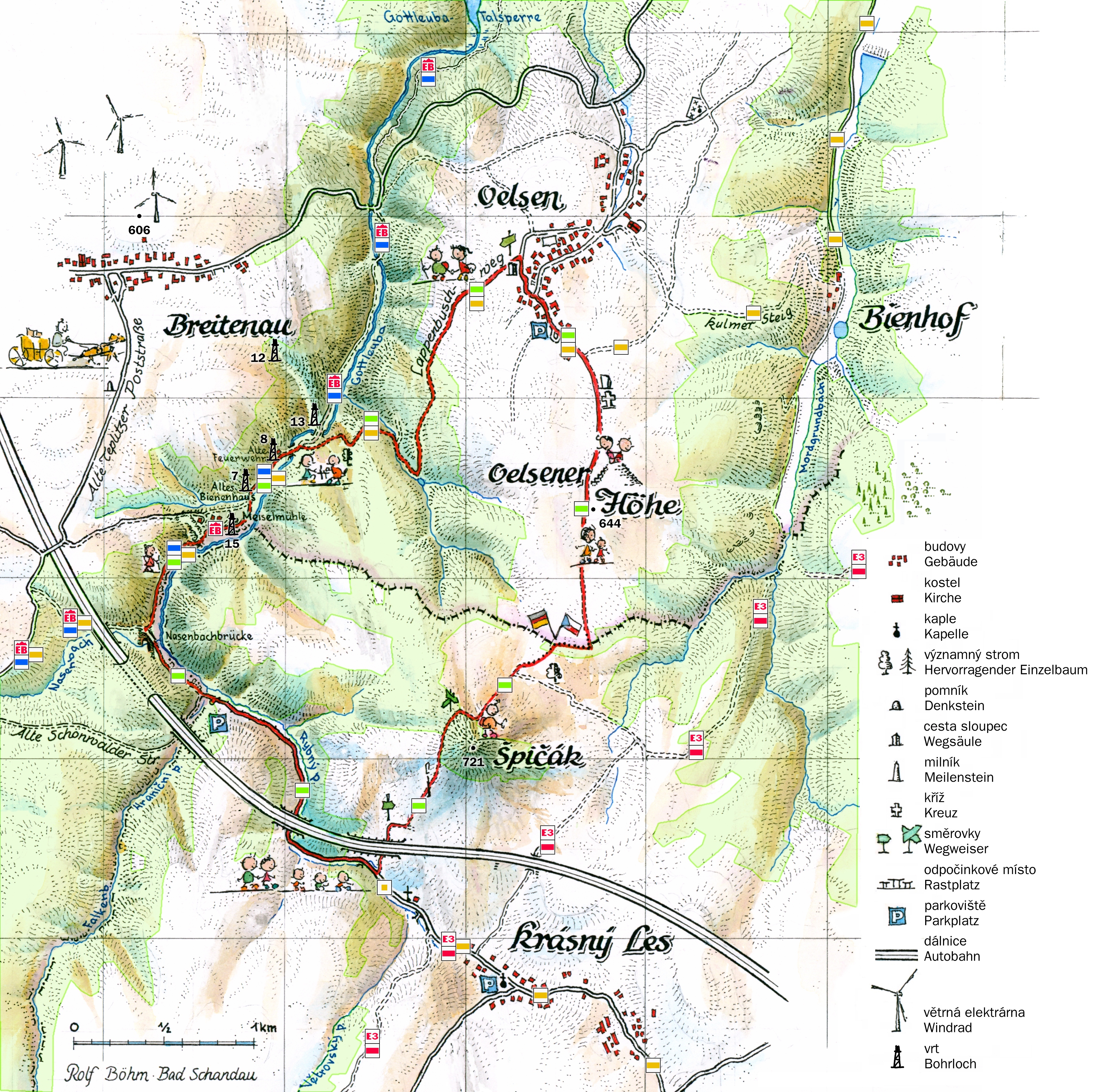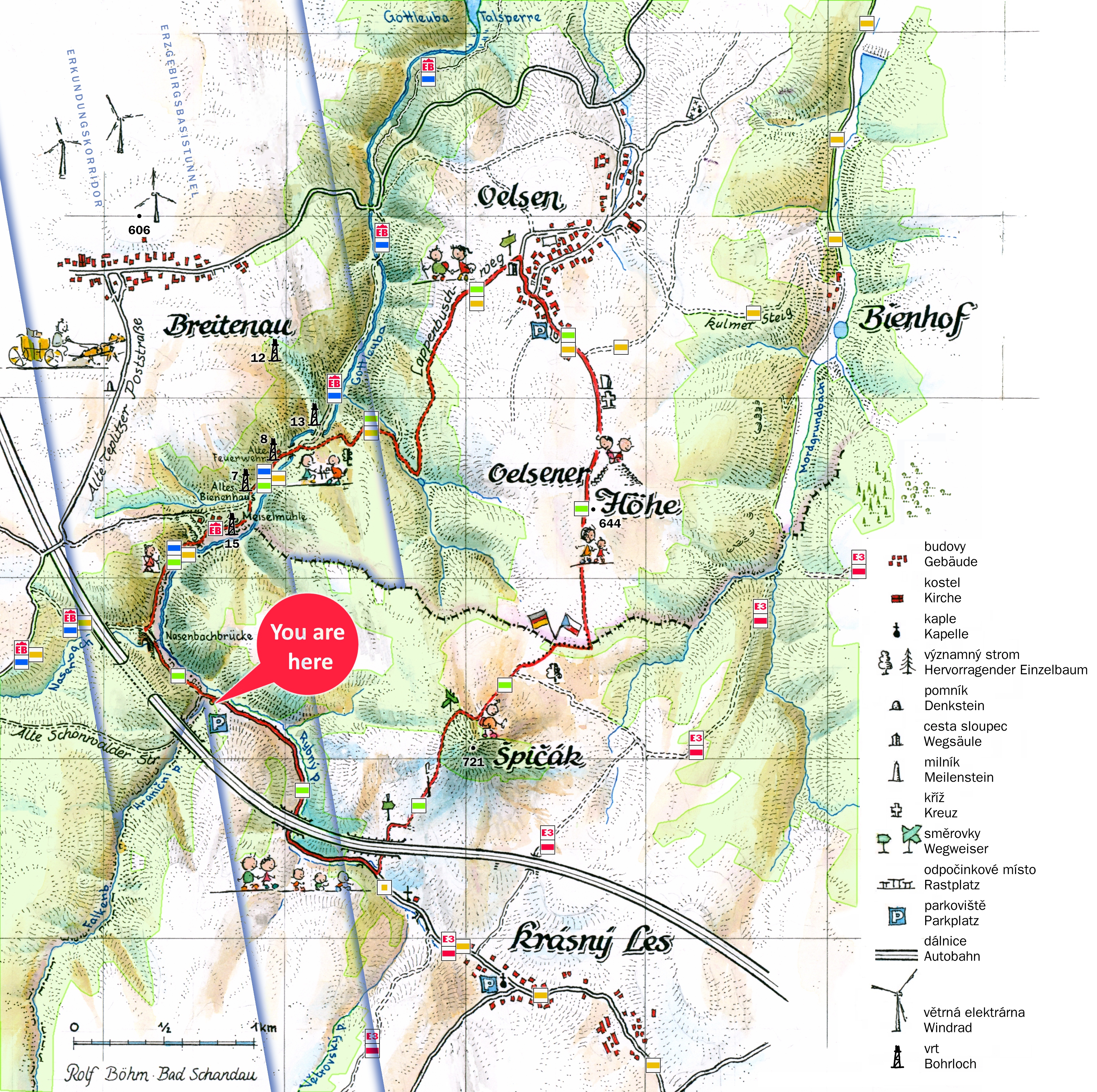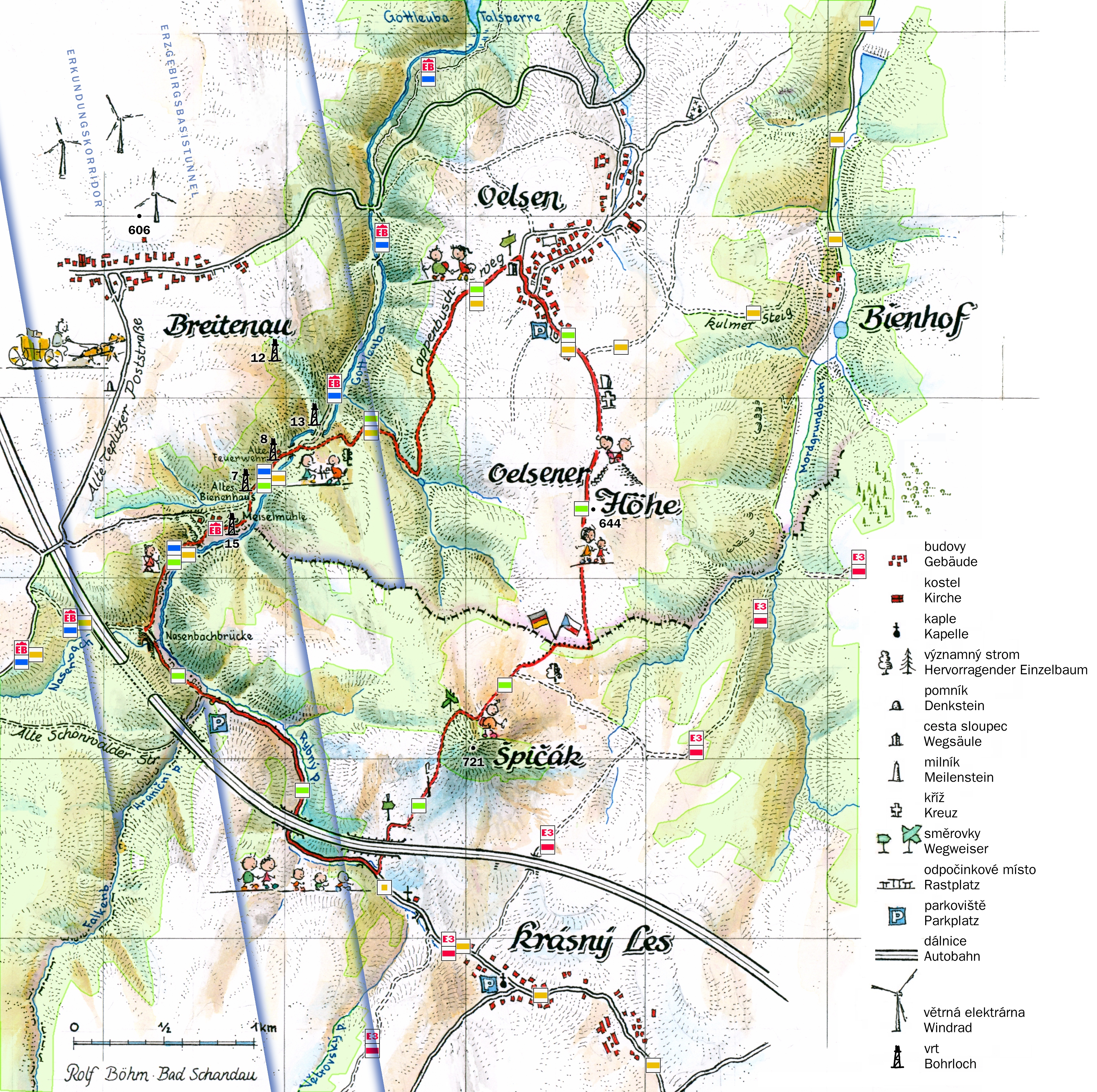 Neu 21.08.2025: Tunnel blau, Rundweg Breitenau entfernt, konsequenterweise aus Hauptweg die Nordschleife Oelsen herausgenommen (die ohne Rundweg Breitenau eine unnötige Wegverlänrerung darstelen würde), Wegerläuterung 2 Wege dt/cz in Legende