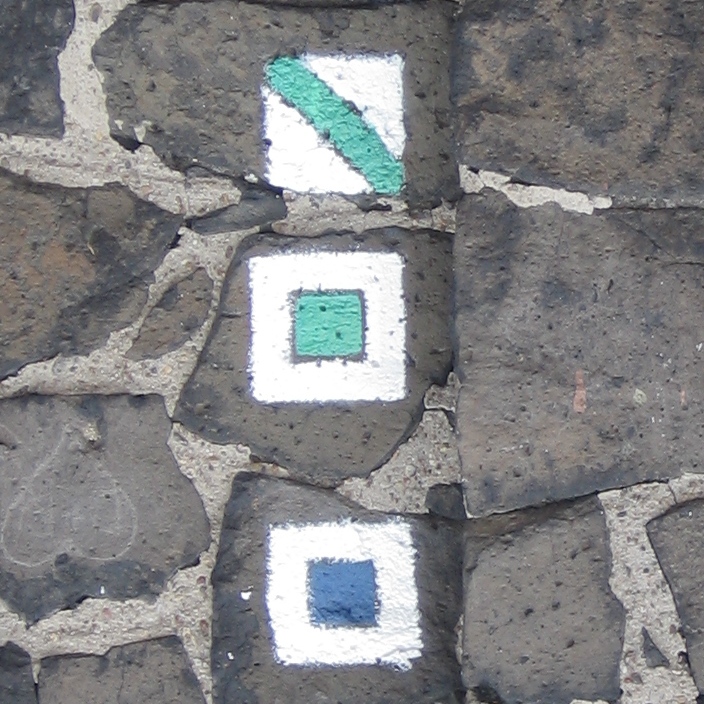 Die 8 Zeichen Rechteck, Raute, Barree, Dreieck, Kreuz, Andereaskreuz, Punkt und Ring bilden einen abgeschlossenen Zeichenformenkanon, aus dem in den üblichen 4 Farben 32 Wegemarken erzeugt werden. Ich war so begeistert, dass ich die Zeichen gleich einmal in „unserer sächsischen“ Zeichengrammatik aufgegriffen und nachgeschnitten habe. Der originale Zeichendukus des Vogesenclubs hat einen etwas anderen Charakter. Es gibt zwei verschiedene örtliche Realisierungen, mit Pinsel aufgetragene Farbmarkierungen an den Bäumen und weiße rechteckigen Emaillemarken.
